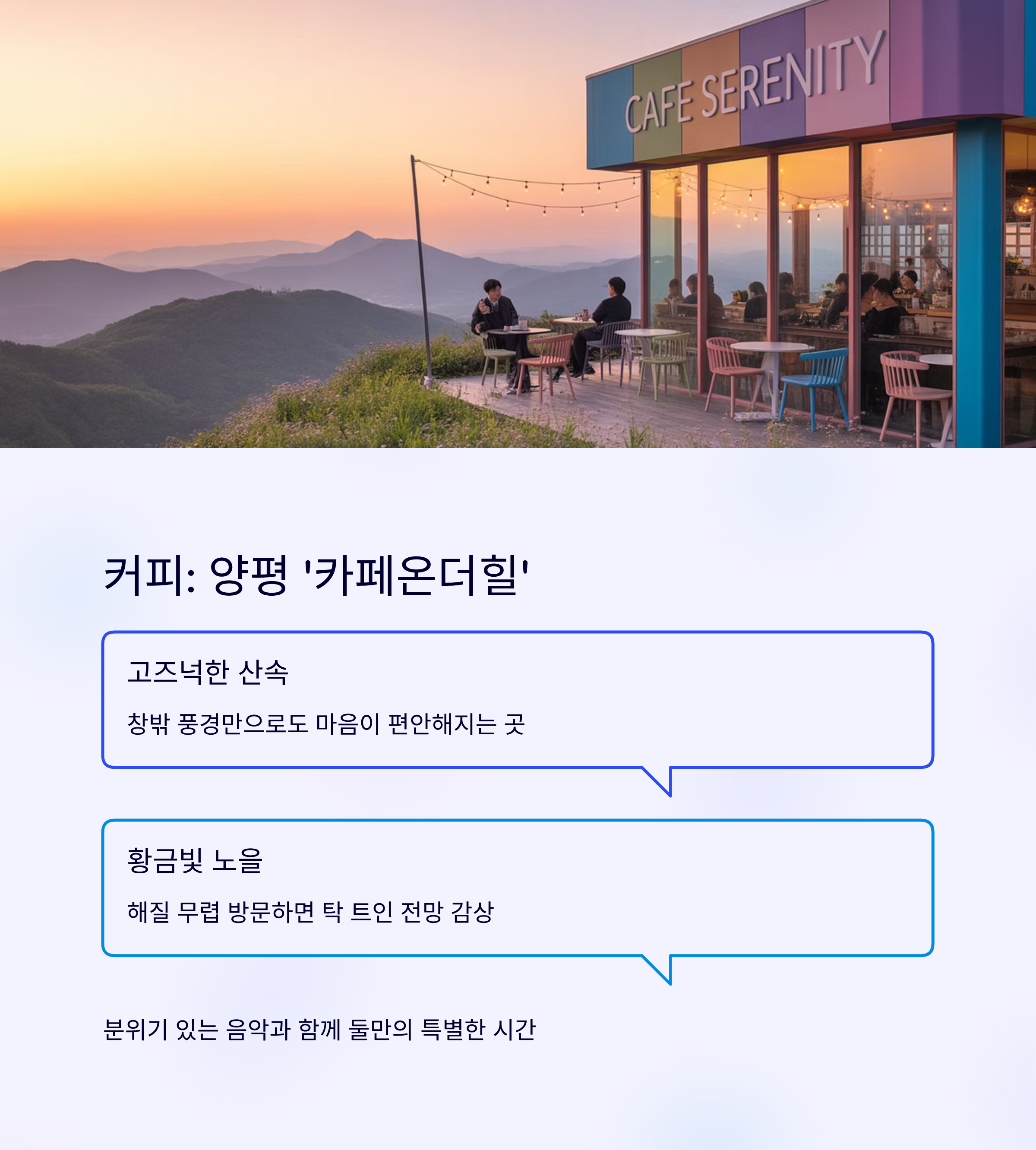조금만 이동하면 나오는 양평의 뷰 카페들도 매력 넘쳐요. ‘카페온더힐’은 고즈넉한 산 속에 위치해 창밖 풍경만으로도 마음이 편안해지는 곳이죠.