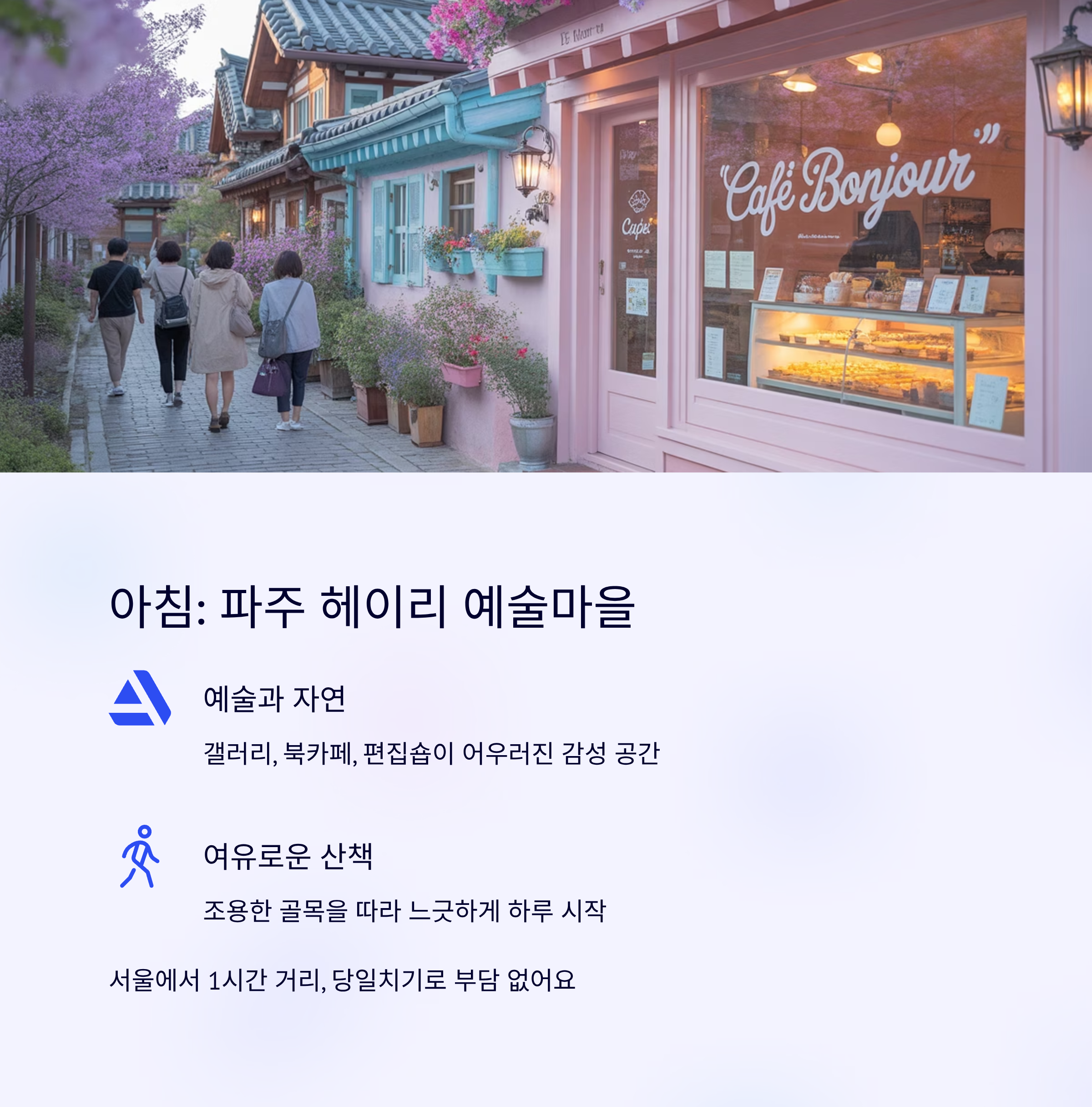 예술과 자연이 어우러진 감성 공간, 파주 헤이리 마을은 서울에서 1시간 남짓 거리에 있어 당일치기로도 부담 없어요. 조용한 골목을 따라 걷다 보면 갤러리, 북카페, 디자인 편집숍까지 다양하게 만날 수 있죠.
