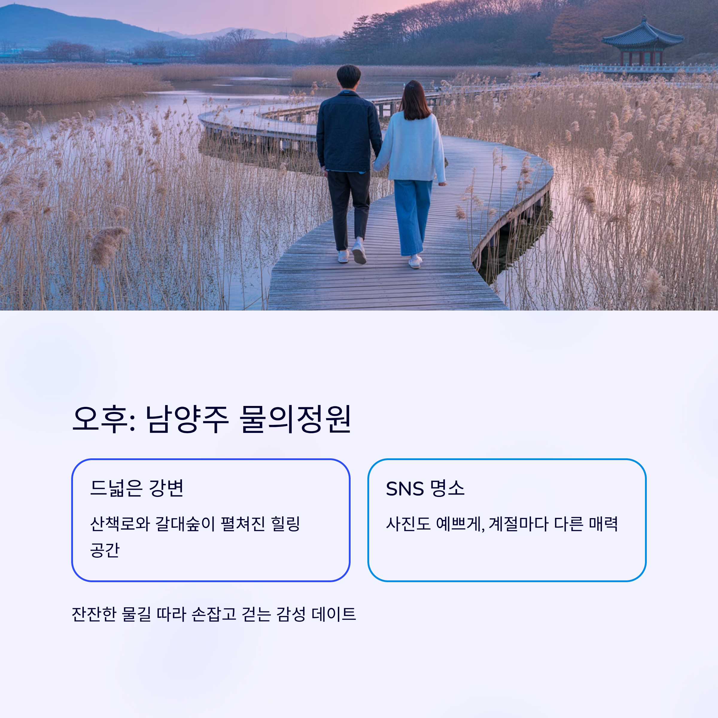자연을 좋아하는 커플이라면 남양주 ‘물의정원’을 추천해요. 드넓은 강변 산책로와 갈대숲이 펼쳐진 이곳은 SNS에서 이미 ‘감성 명소’로 유명해졌죠.