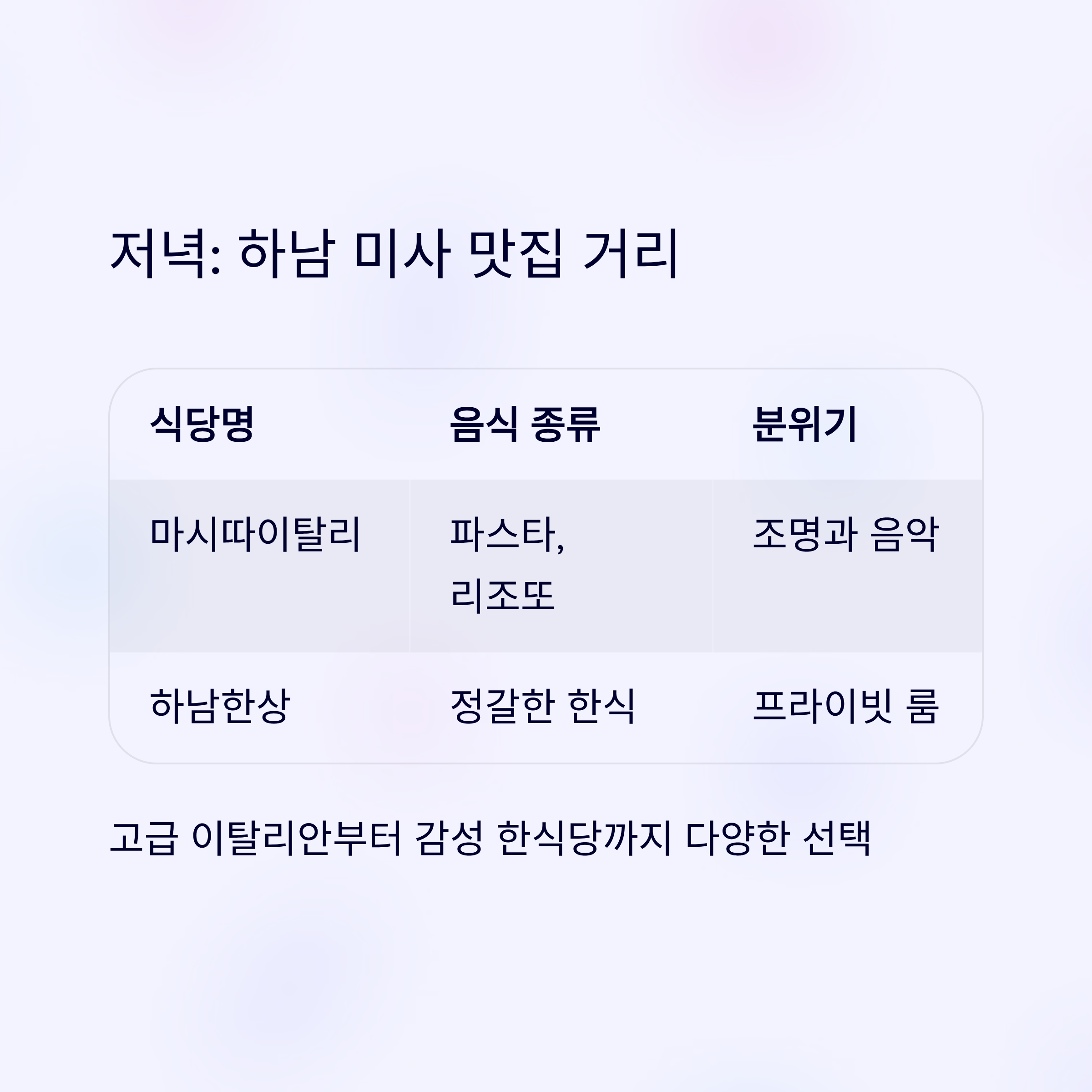 데이트의 마무리는 역시 맛있는 저녁이죠! 하남 미사 지역은 다양한 음식점들이 밀집되어 있어 무엇을 먹어도 실패할 확률이 적어요.