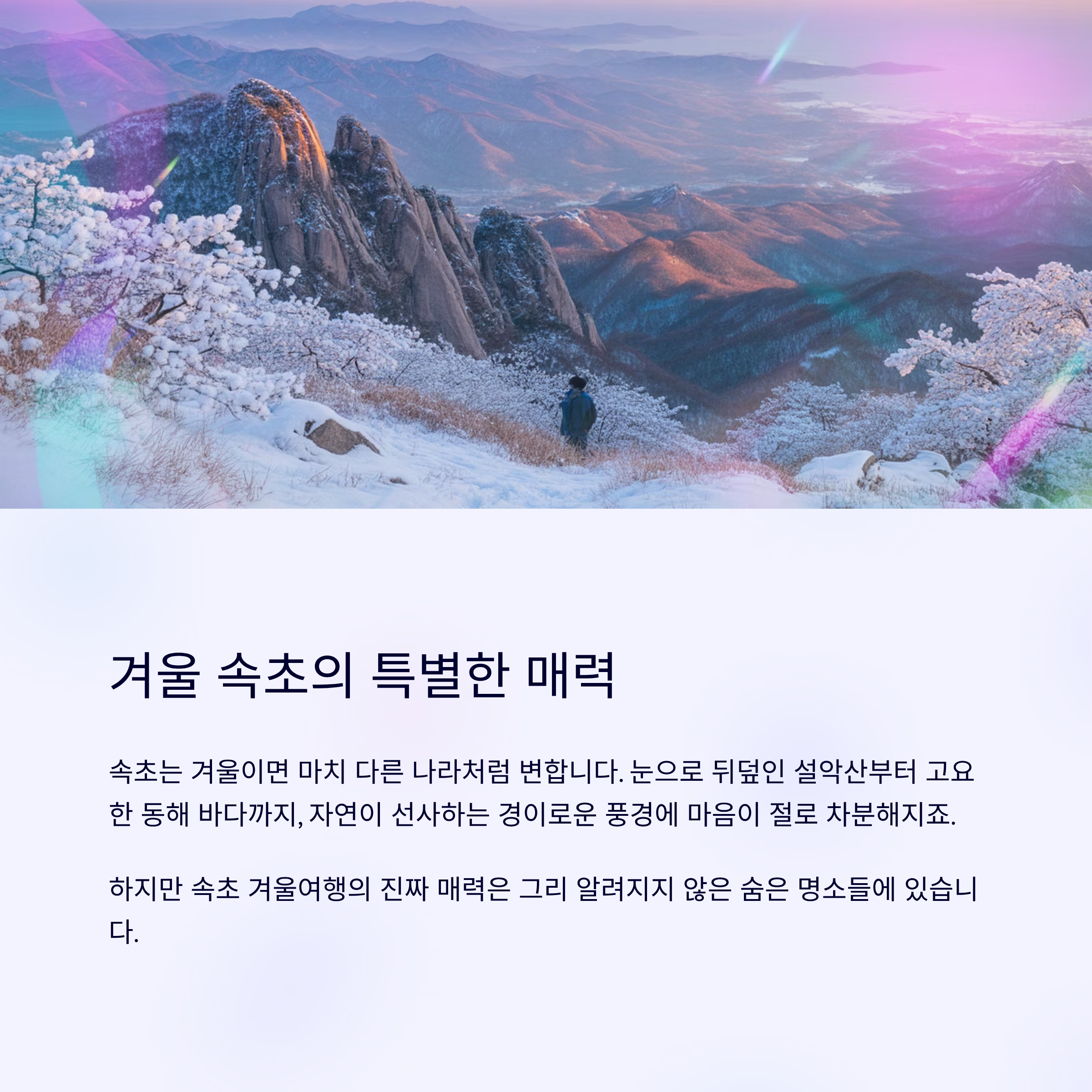 속초는 겨울이면 마치 다른 나라처럼 변합니다. 눈으로 뒤덮인 설악산부터 고요한 동해 바다까지, 자연이 선사하는 경이로운 풍경에 마음이 절로 차분해지죠. 하지만 속초 겨울여행의 진짜 매력은 그리 알려지지 않은 숨은 명소들에 있습니다. 이 글에서는 눈꽃과 함께 즐길 수 있는 속초의 특별한 겨울 여행지들을 하나씩 소개해드릴게요.
