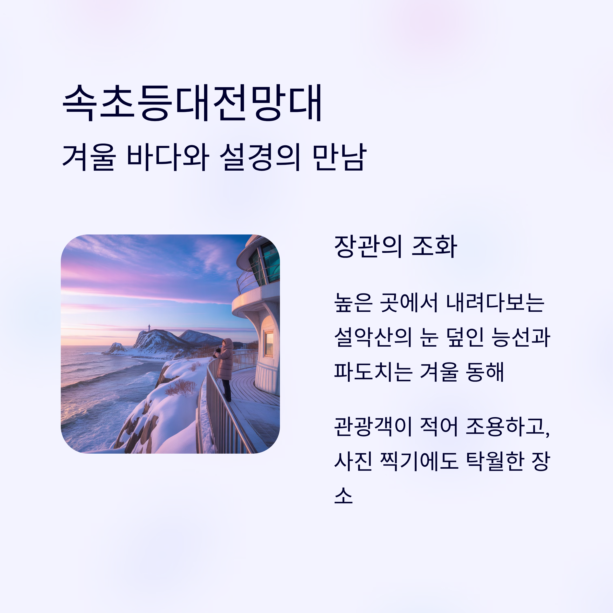| 속초등대전망대 | 설경+동해 조망 | 오후 시간대 햇살과 어울림 최고 |