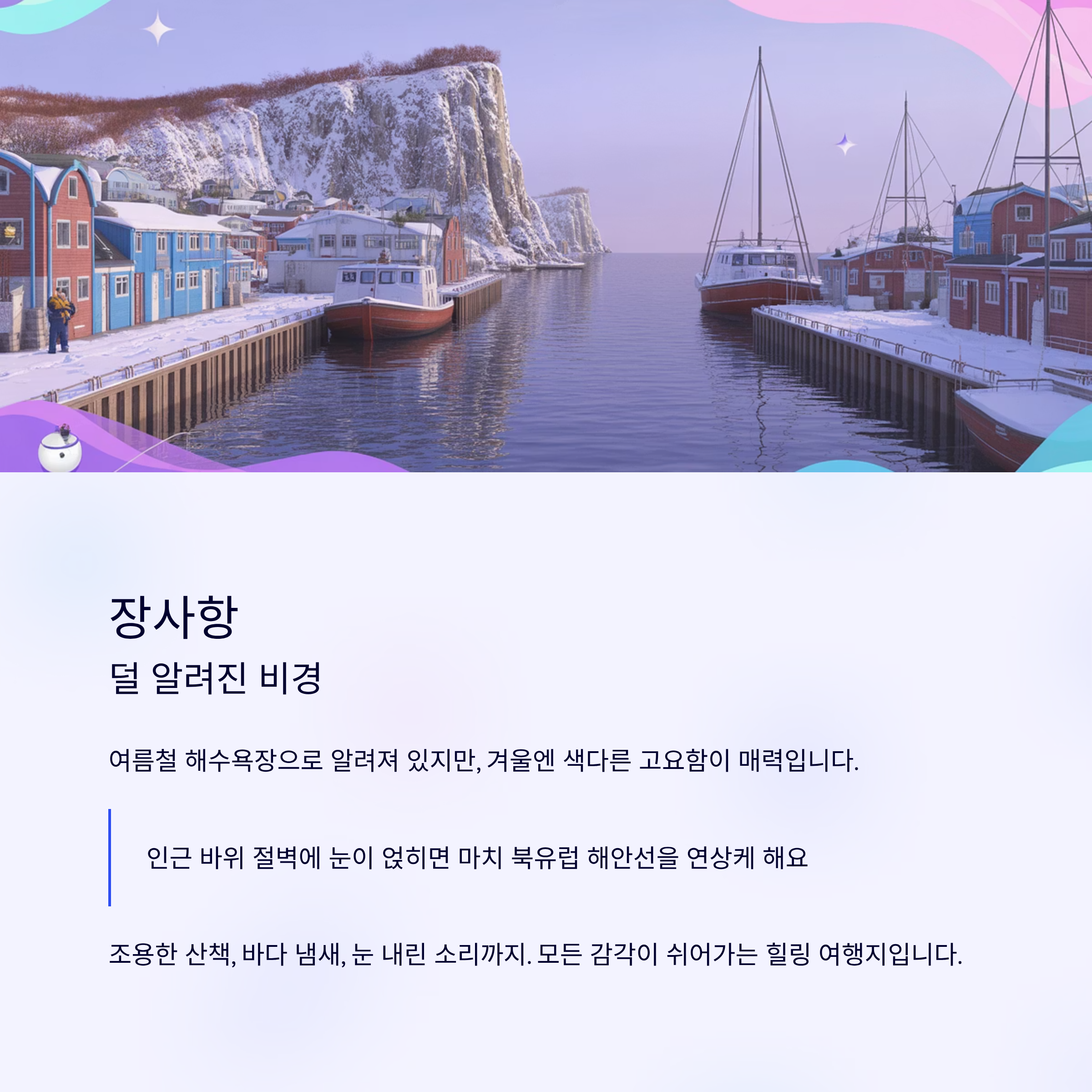 조용한 산책, 바다 냄새, 눈 내린 소리까지. 모든 감각이 쉬어가는 이곳은 힐링 여행지로 더할 나위 없습니다.