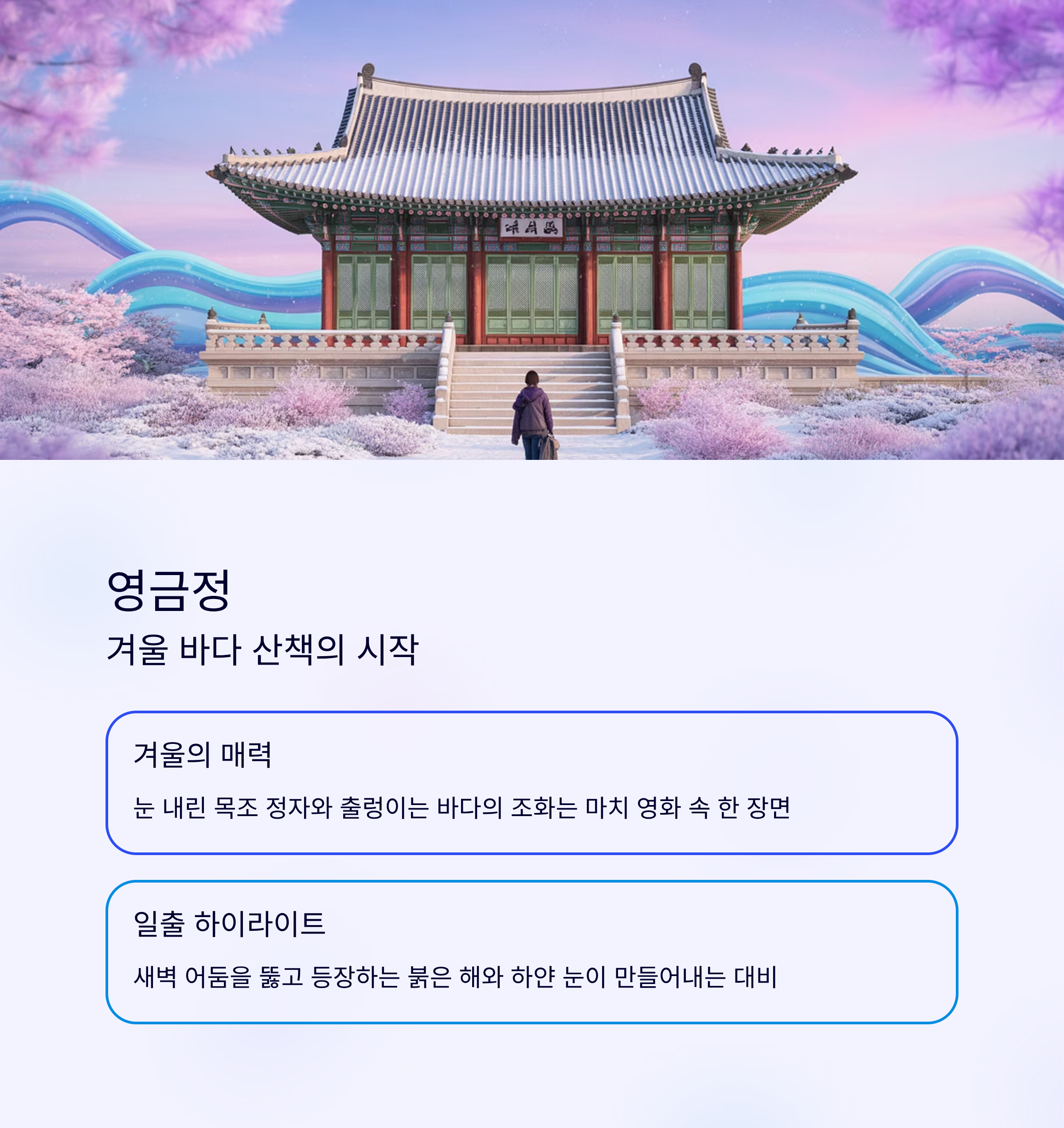 영금정은 사계절 내내 인기지만, 겨울에 찾으면 또 다른 매력을 발견하게 됩니다. 눈 내린 목조 정자와 출렁이는 바다의 조화는 마치 영화 속 한 장면 같죠.