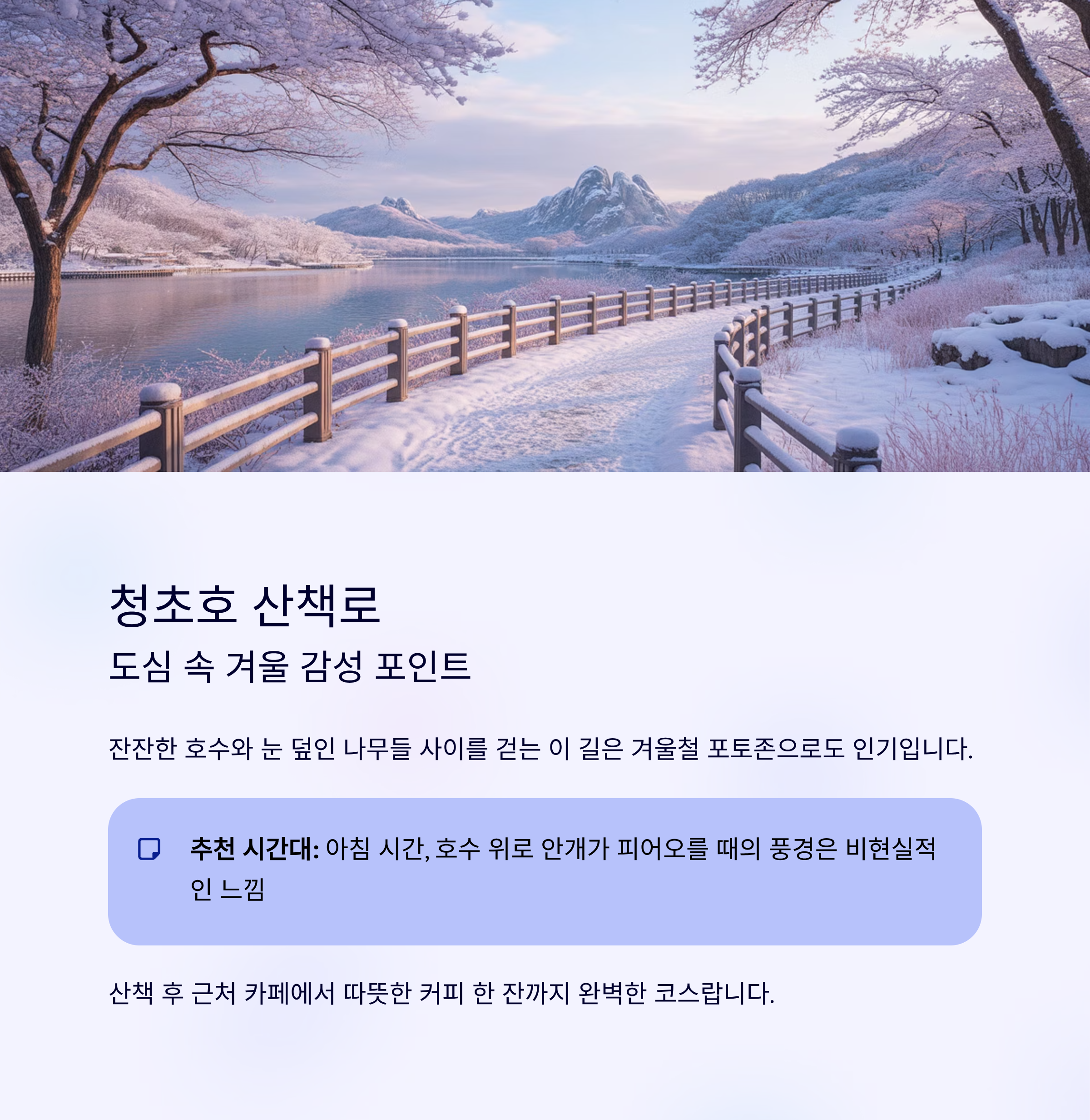 관광지보다는 조용한 분위기를 원하신다면 청초호 산책로가 제격이에요. 잔잔한 호수와 눈 덮인 나무들 사이를 걷는 이 길은 겨울철 포토존으로도 인기입니다.