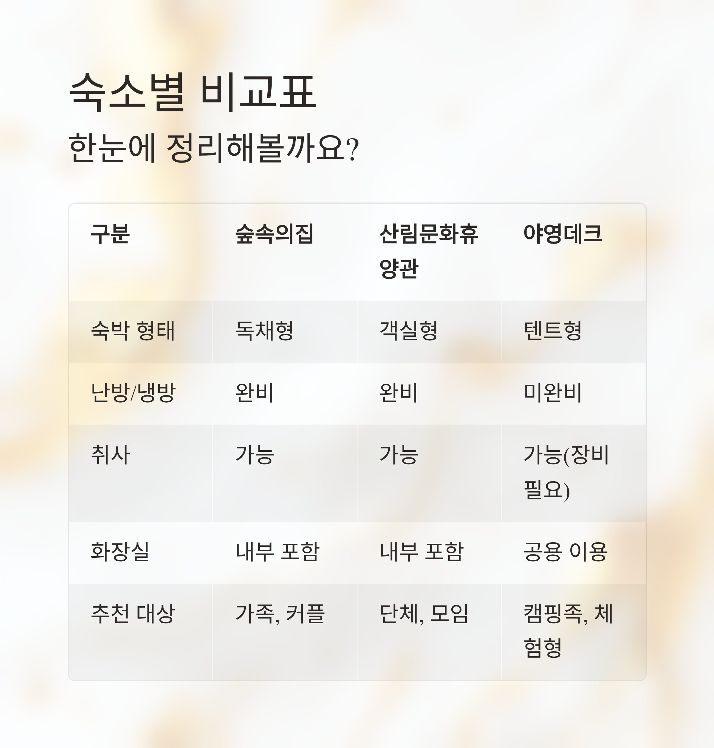 | 숙박 형태 | 독채형 | 객실형 | 텐트형 |
