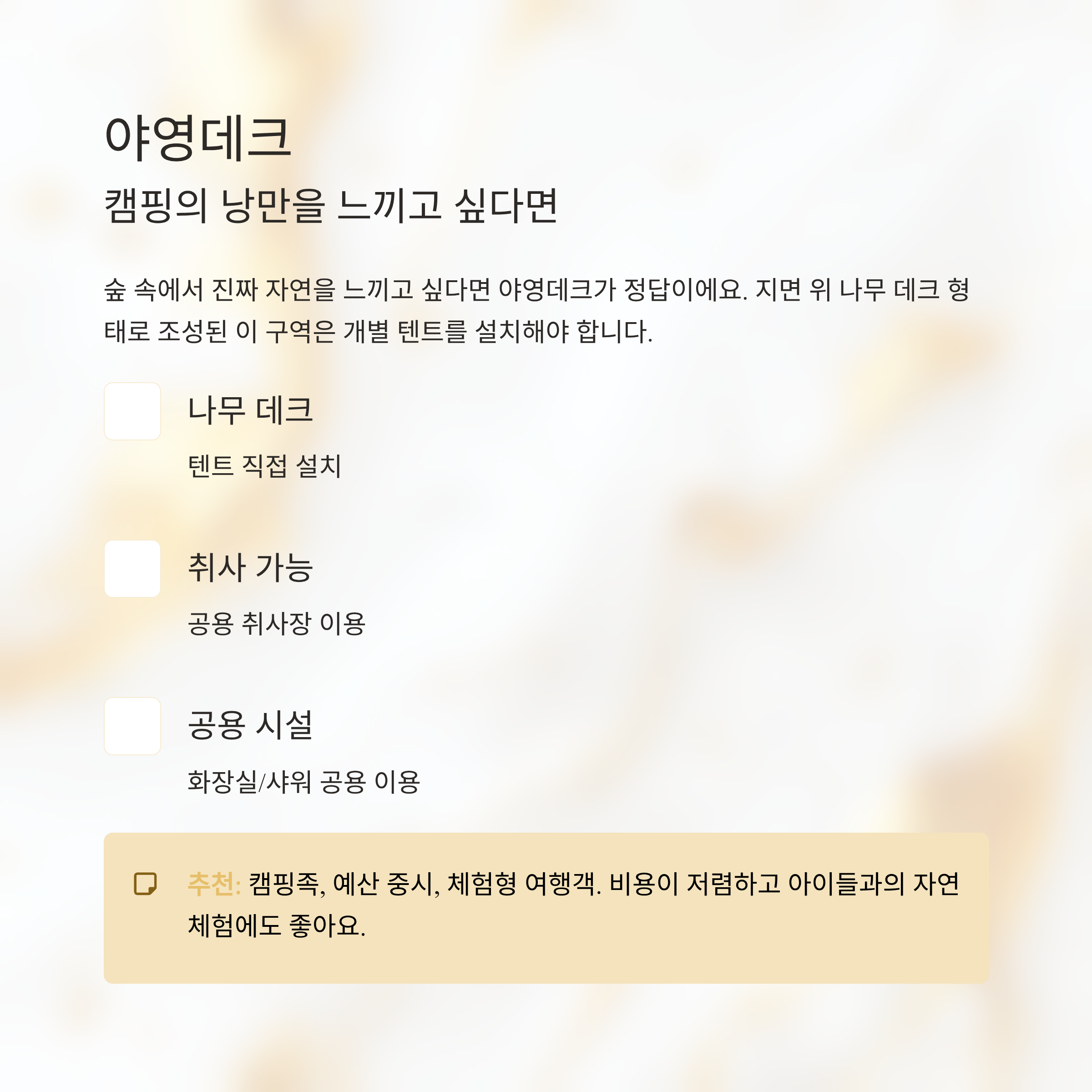 | 추천 대상 | 캠핑족, 예산 중시, 체험형 여행객 |