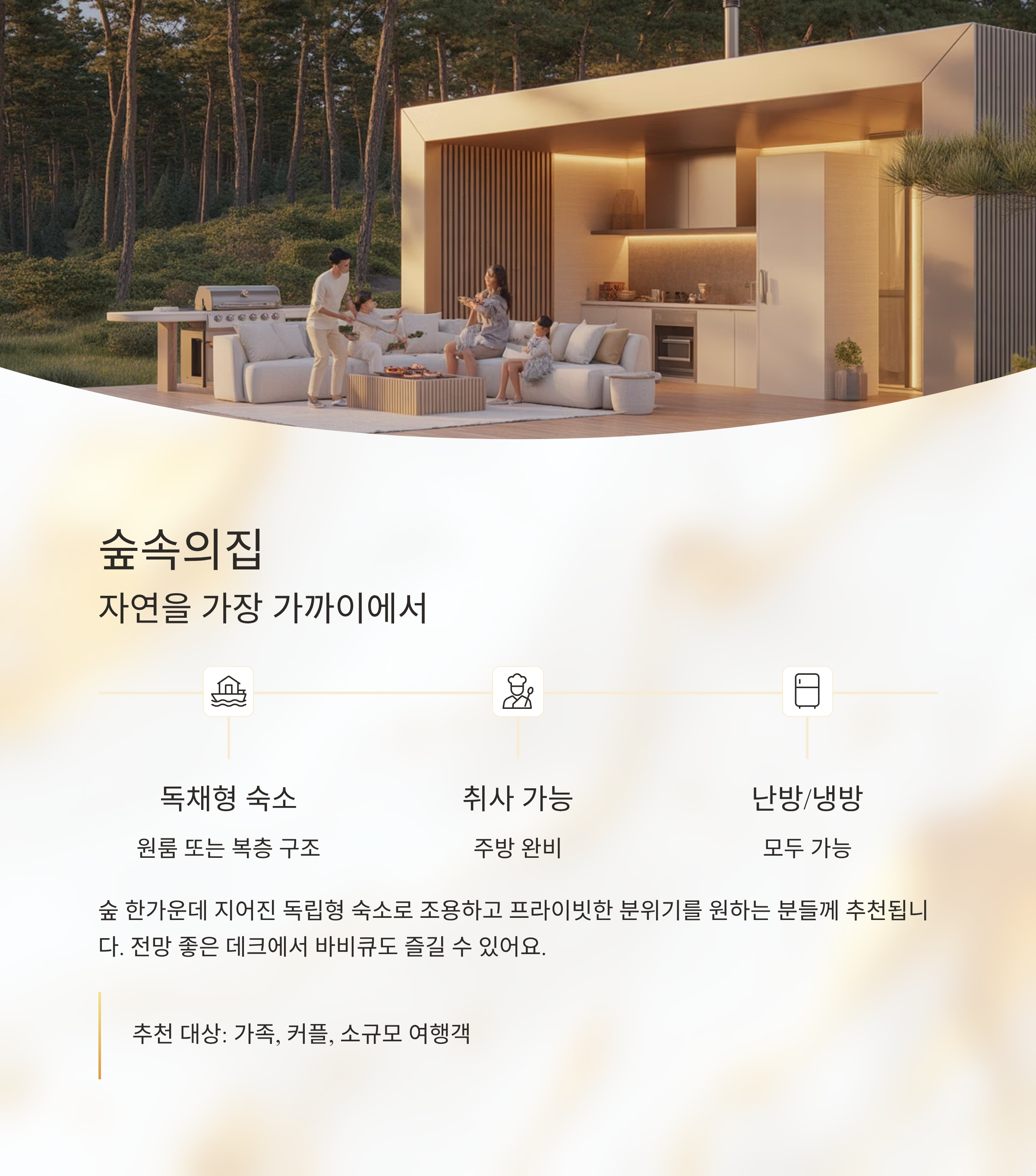 | 형태 | 독채형 숙소 (원룸 또는 복층) |