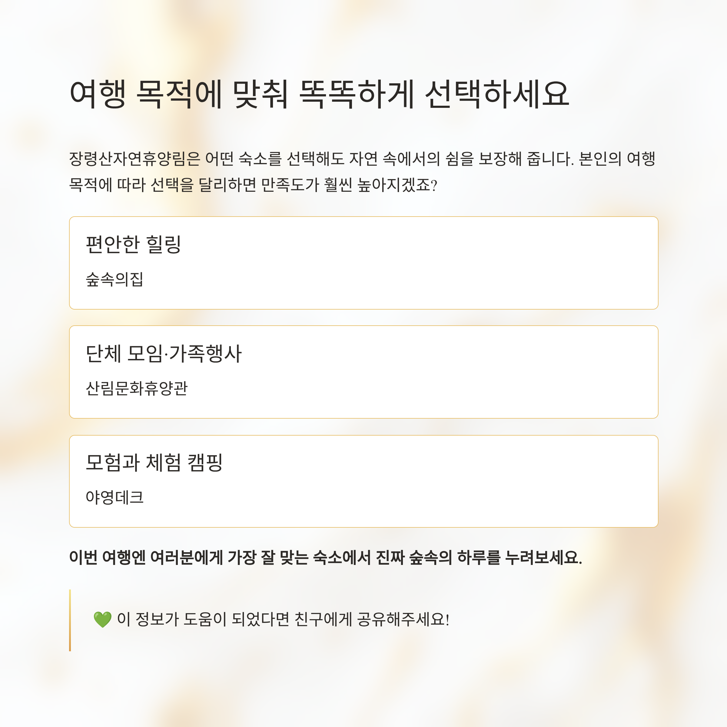 숲속 힐링, 숙소냐 캠핑이냐! 당신의 여행 스타일에 맞는 선택은?장령산자연휴양림은 숙박과 야영 두 가지 방식 모두를 즐길 수 있어 여행자의 스타일에 따라 선택의 폭이 넓은 곳이에요. 하지