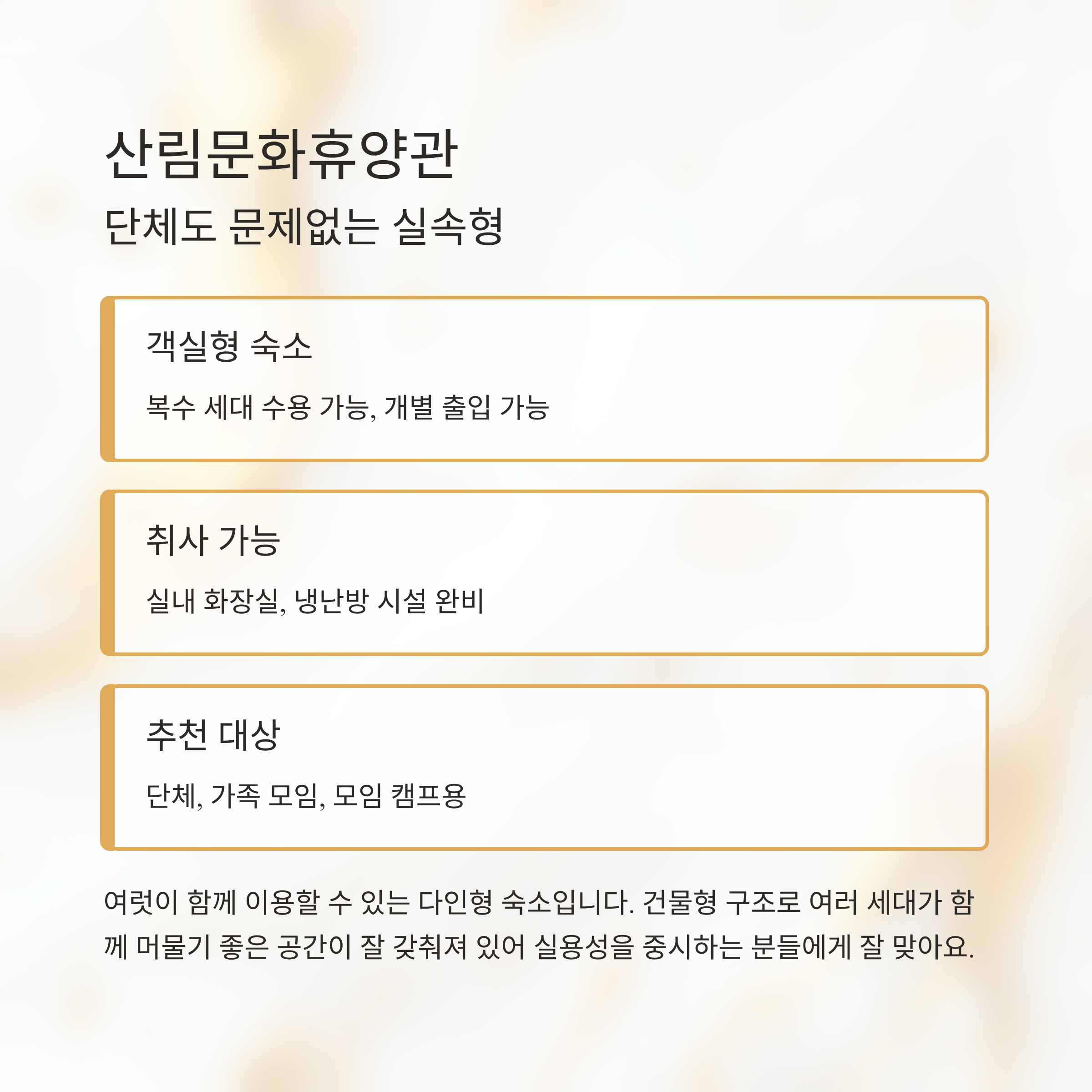 | 형태 | 객실형 숙소 (복수 세대 수용 가능) |