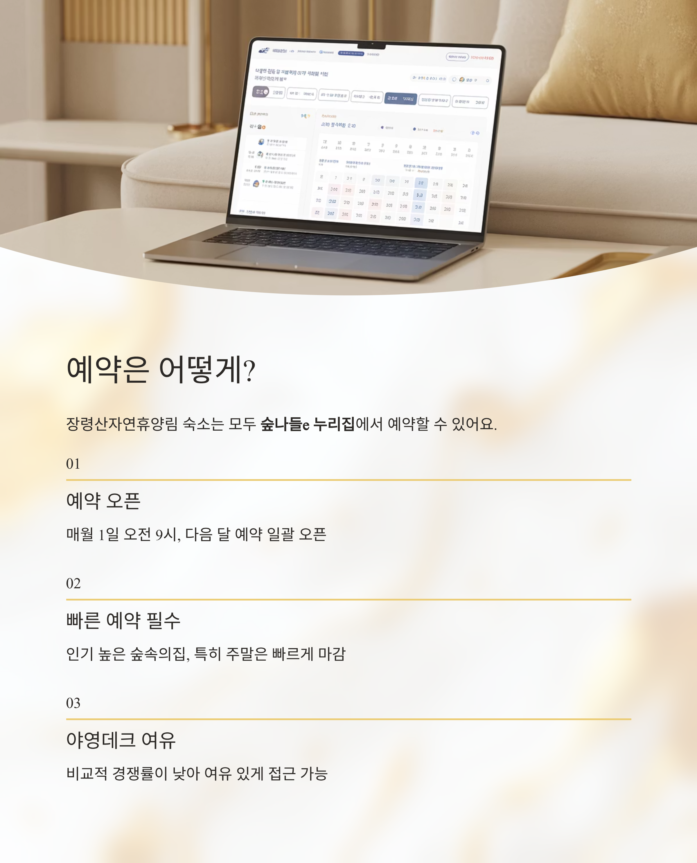 - 야영데크는 비교적 경쟁률이 낮아 여유 있게 접근 가능합니다.