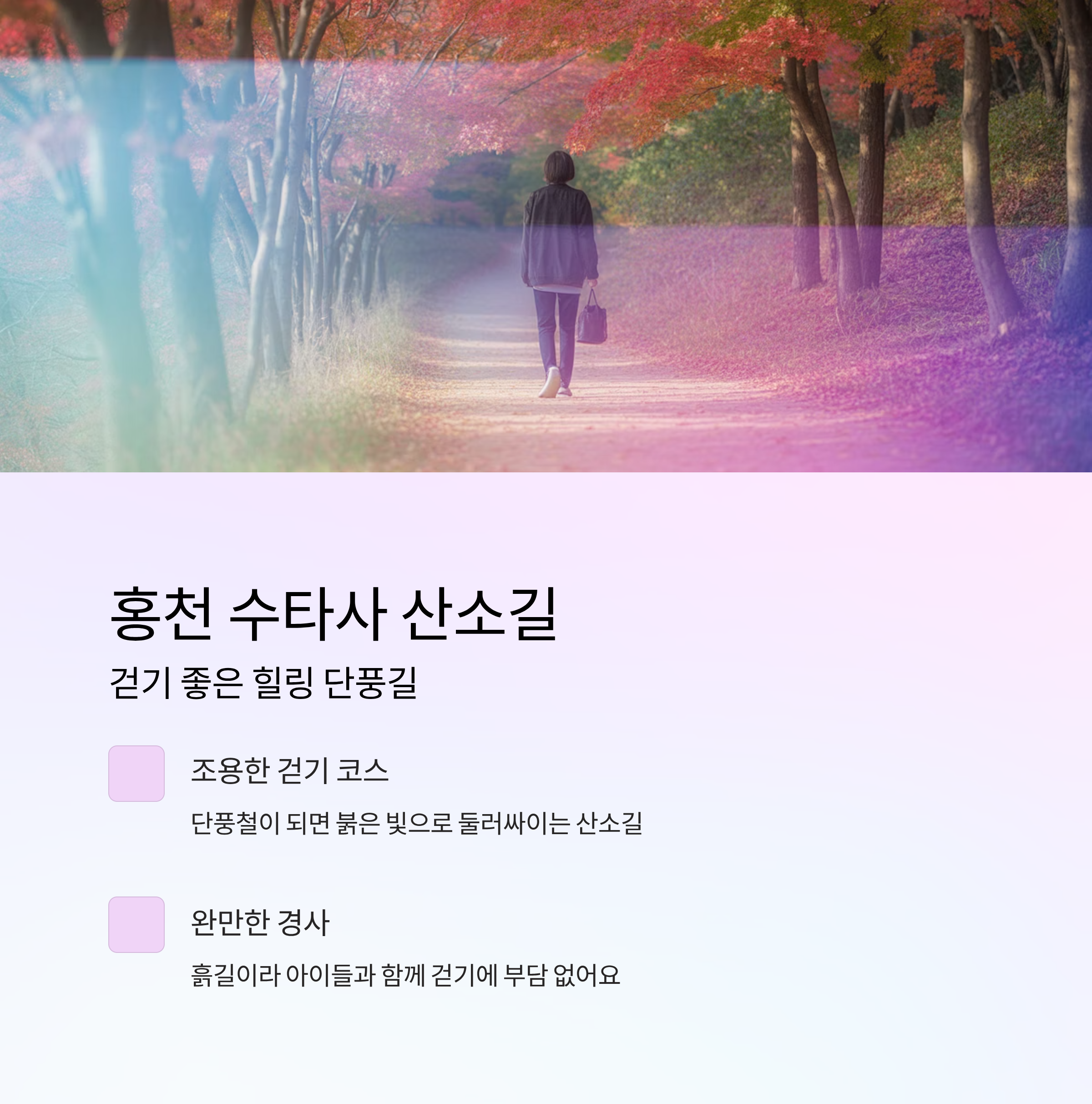 | 수타사 산소길 | 강원 홍천 | 평탄한 흙길, 가벼운 트레킹 코스 |