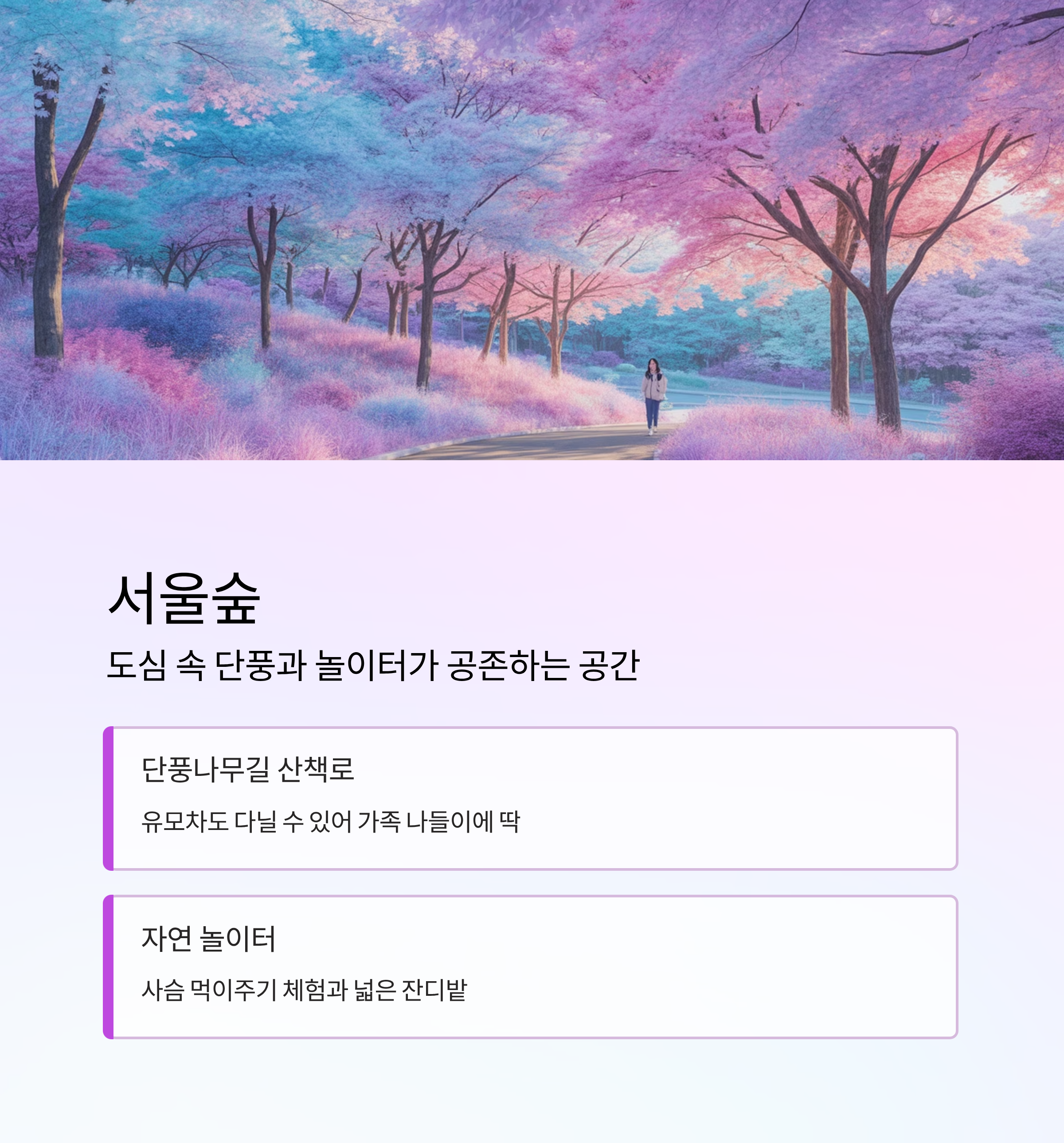 | 서울숲 | 서울 성동구 | 놀이터, 사슴 체험, 단풍 산책길 |