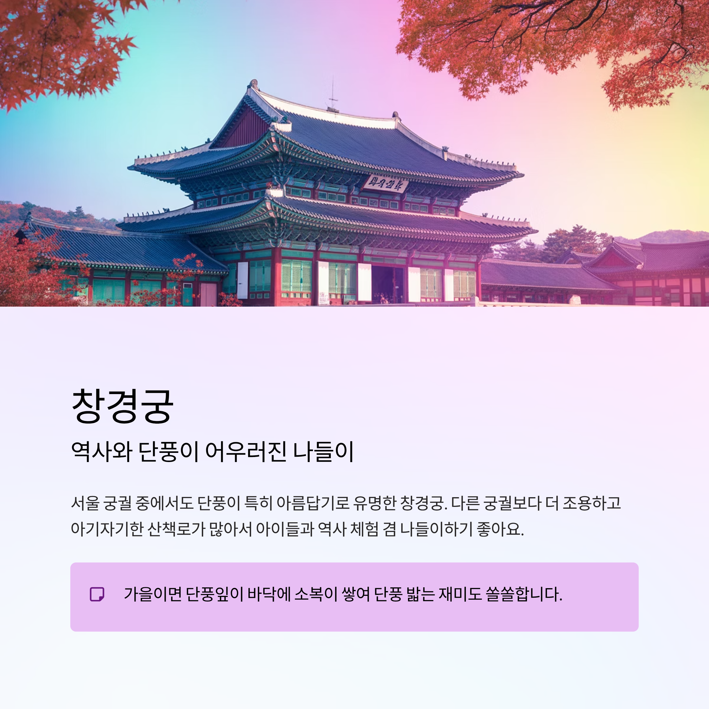 | 창경궁 | 서울 종로구 | 궁궐 속 단풍, 역사 체험 가능 |