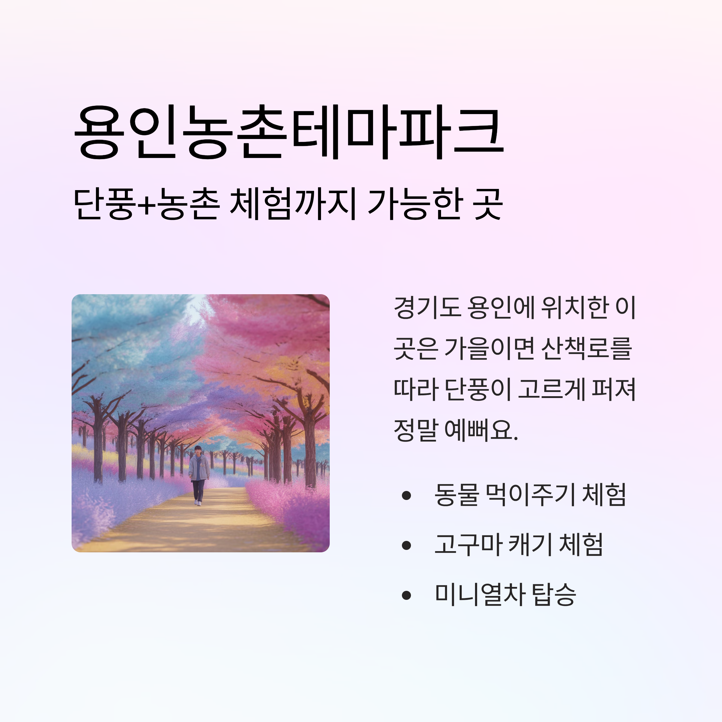 | 용인농촌테마파크 | 경기 용인 | 농촌 체험+단풍길 |