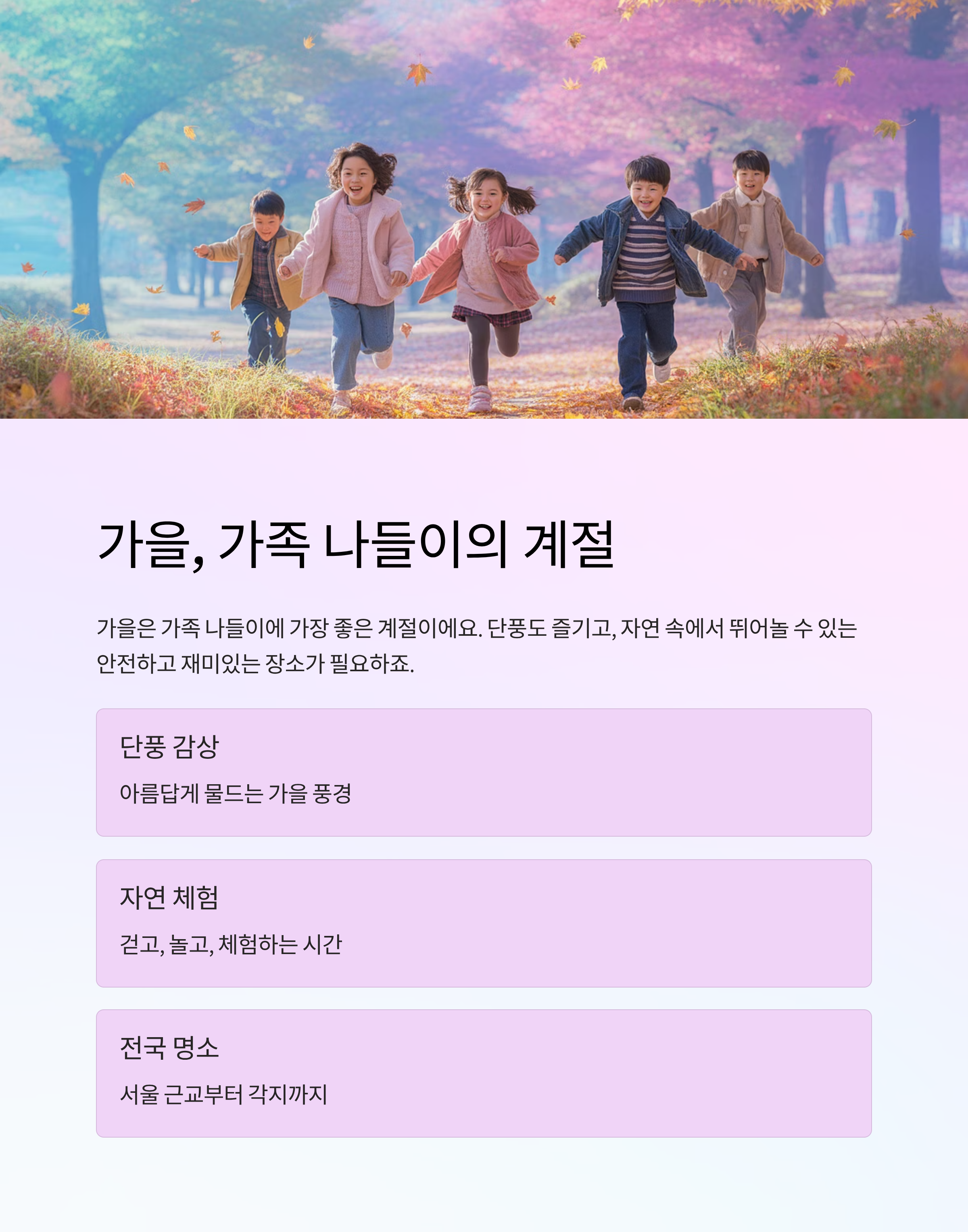 가을 정취도 느끼고, 아이들도 신나게 놀 수 있는 단풍 여행지는 어디일까요?