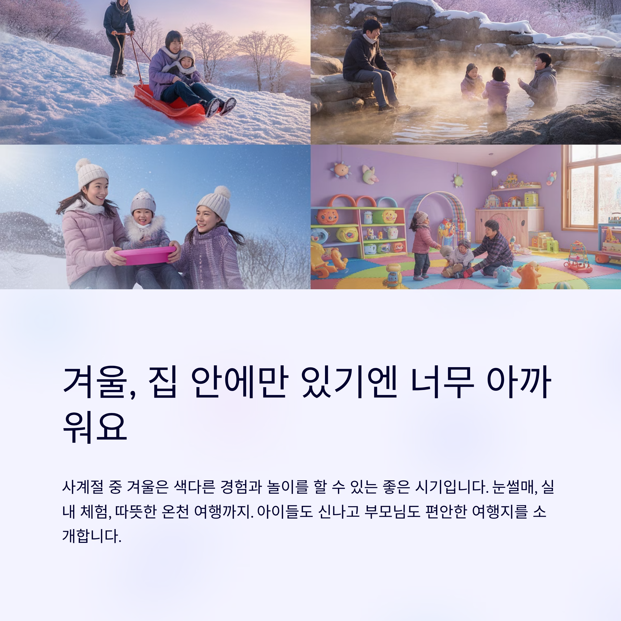 사계절 중 겨울은 색다른 경험과 놀이를 할 수 있는 좋은 시기입니다. 눈썰매, 실내 체험, 따뜻한 온천 여행까지.