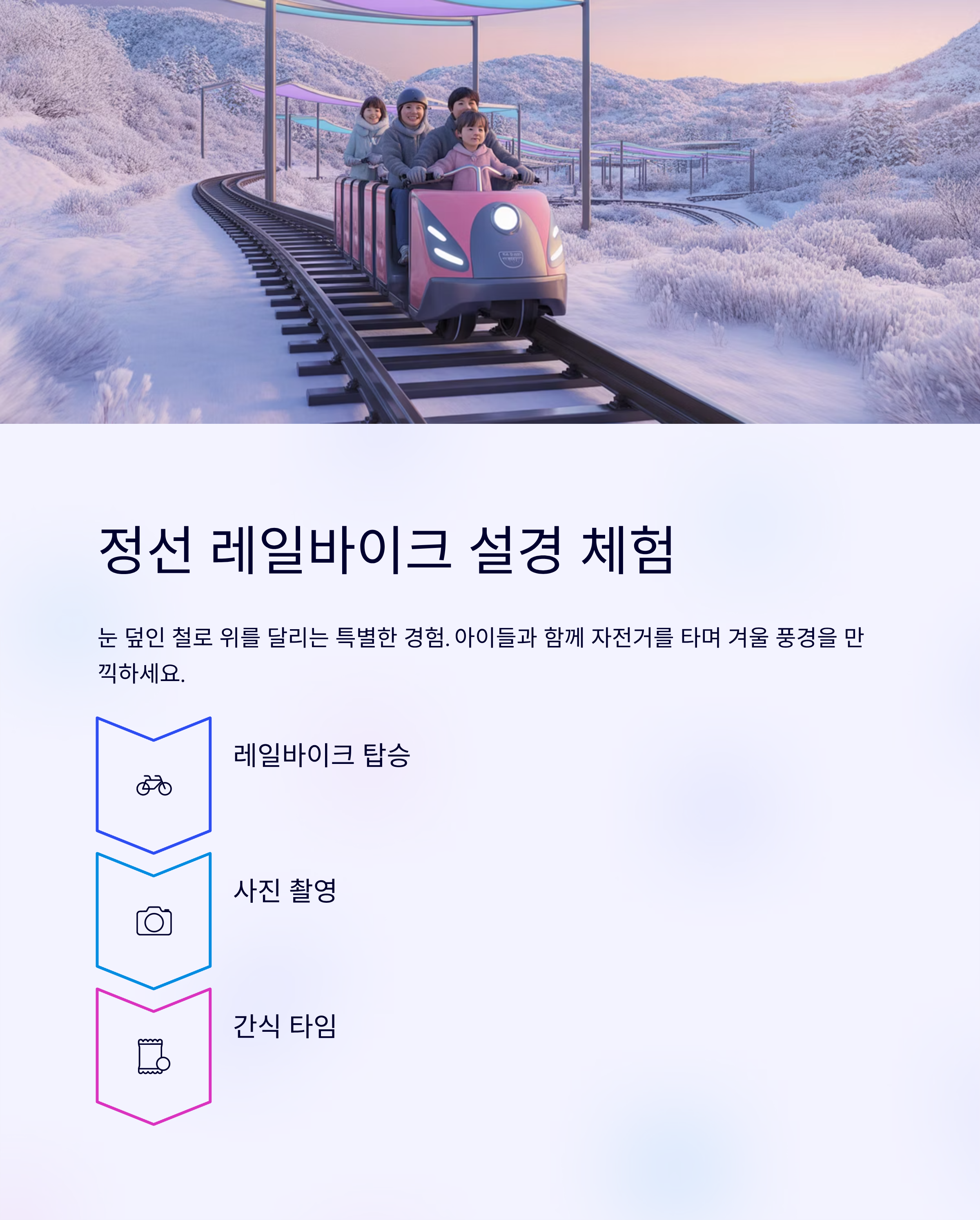 아이들과 함께 자전거를 타고 눈 덮인 철로 위를 달리는 기분, 상상해보세요.