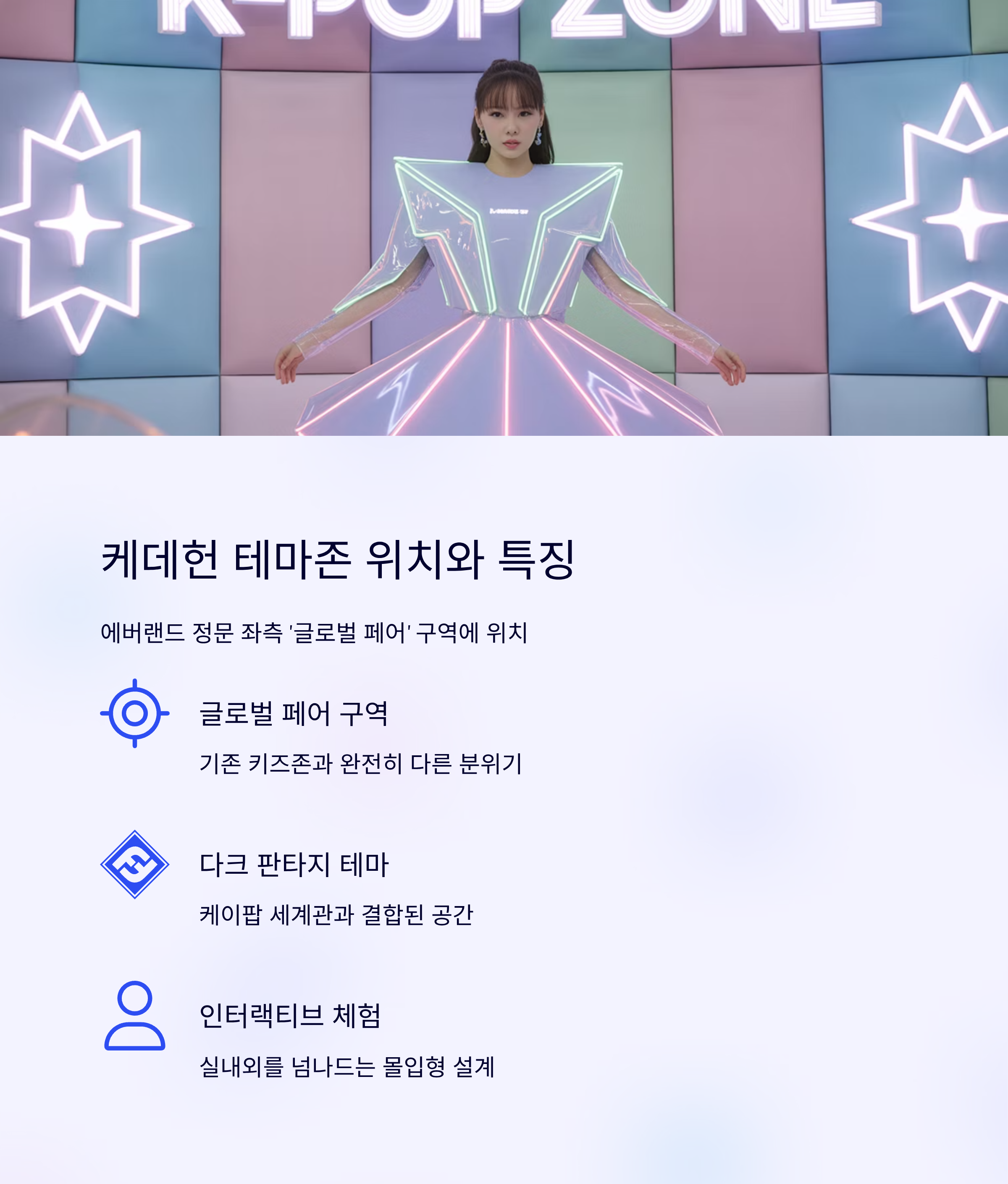 케이팝 세계관과 다크 판타지 테마가 결합된 공간으로, 실내외를 넘나드는 인터랙티브 체험이 특징입니다.