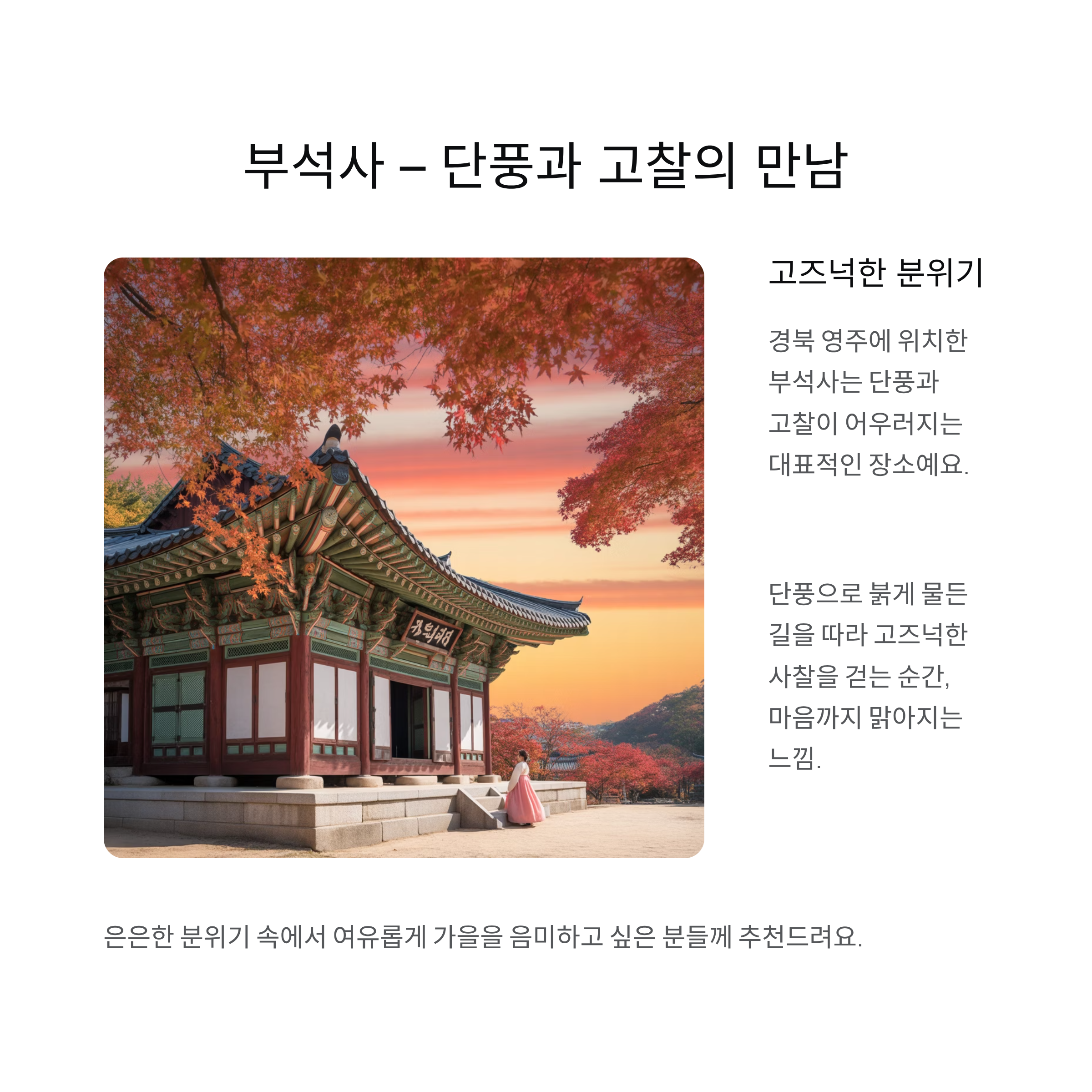 경북 영주에 위치한 부석사는 단풍과 고찰이 어우러지는 대표적인 장소예요. 단풍으로 붉게 물든 길을 따라 고즈넉한 사찰을 걷는 순간, 마음까지 맑아지는 느낌. 은은한 분위기 속에서 여유롭게 가을을 음미하고 싶은 분들께 추천드려요.