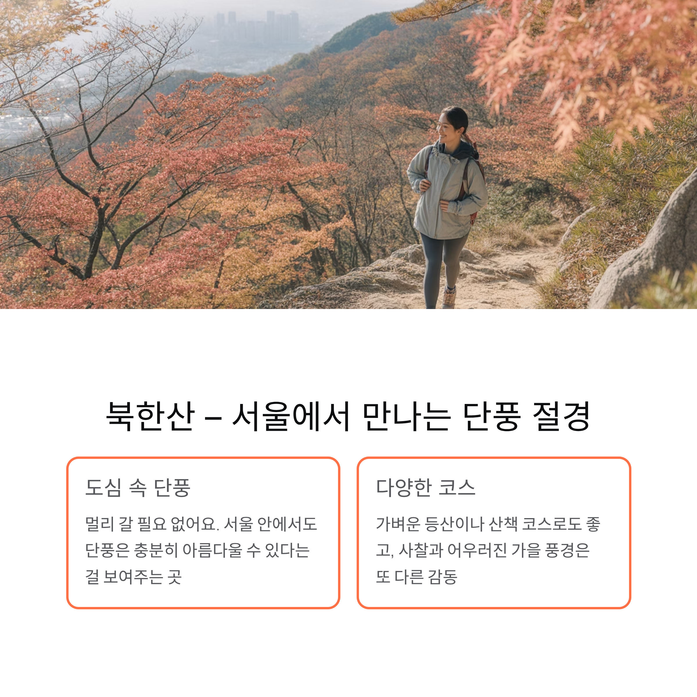 멀리 갈 필요 없어요. 서울 안에서도 단풍은 충분히 아름다울 수 있다는 걸 보여주는 곳이 바로 북한산입니다. 도심 속에서도 이렇게 멋진 풍경이 가능하다니! 가벼운 등산이나 산책 코스로도 좋고, 사찰과 어우러진 가을 풍경은 또 다른 감동을 줘요.
