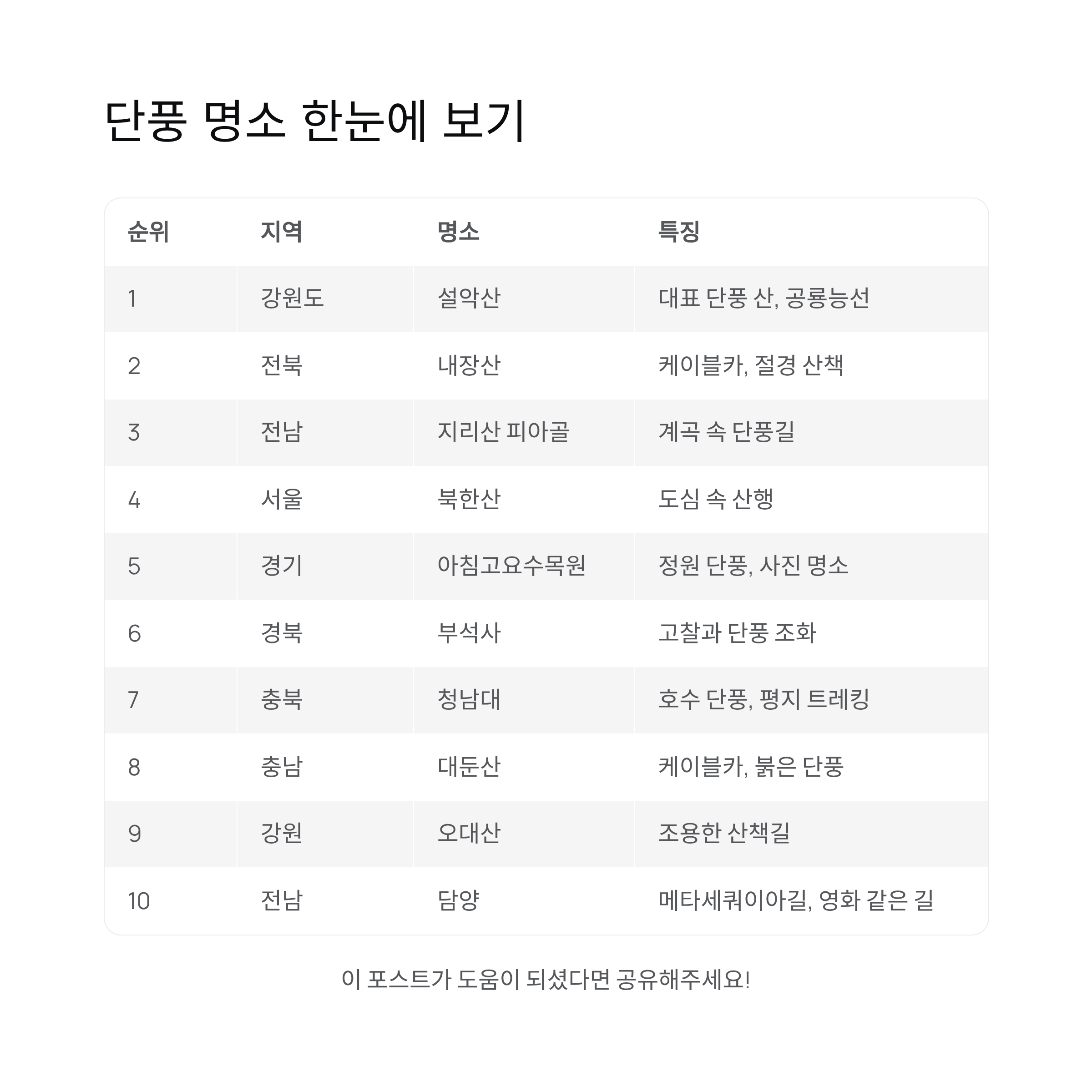 선선한 바람이 불고, 나뭇잎이 하나둘 붉게 물들기 시작하면 단풍 여행의 계절이 왔다는 신호입니다. 매년 가을, 전국 곳곳이 알록달록한 풍경으로 물드는 이때. 이번엔 어디를 가야 후회 없을까요? 진짜 가봐야 할 전국 단풍 명소 10곳을 정리해봤어요. 유명하지만 여전히 매력적인 곳, 그리고 아직 많이 알려지지 않은 숨은 단풍 스팟까지 담았습니다.