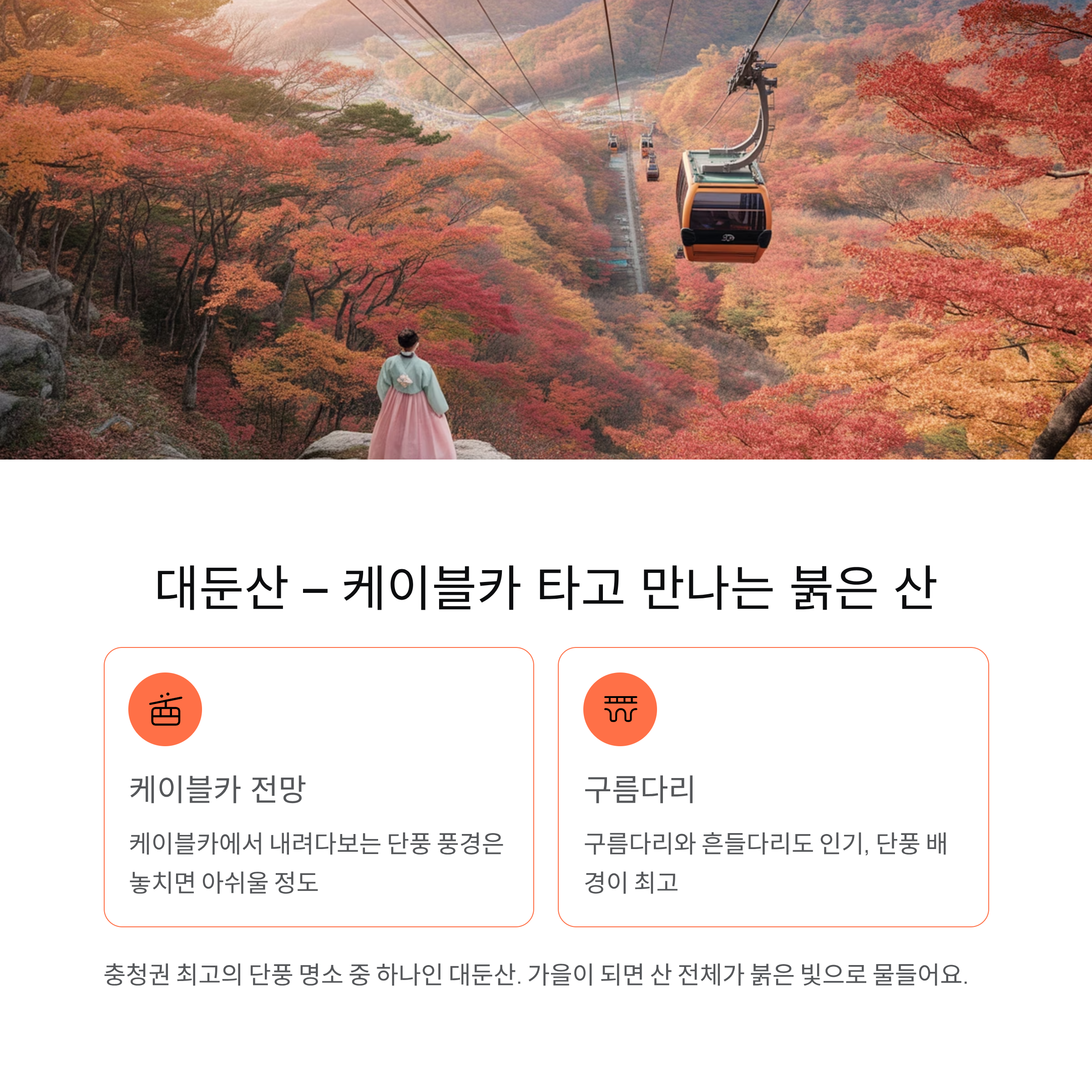 충청권 최고의 단풍 명소 중 하나인 대둔산. 가을이 되면 산 전체가 붉은 빛으로 물들어요. 특히 케이블카에서 내려다보는 단풍 풍경은 놓치면 아쉬울 정도. 구름다리와 흔들다리도 인기지만, 사진 찍기엔 역시 단풍 배경이 최고예요.