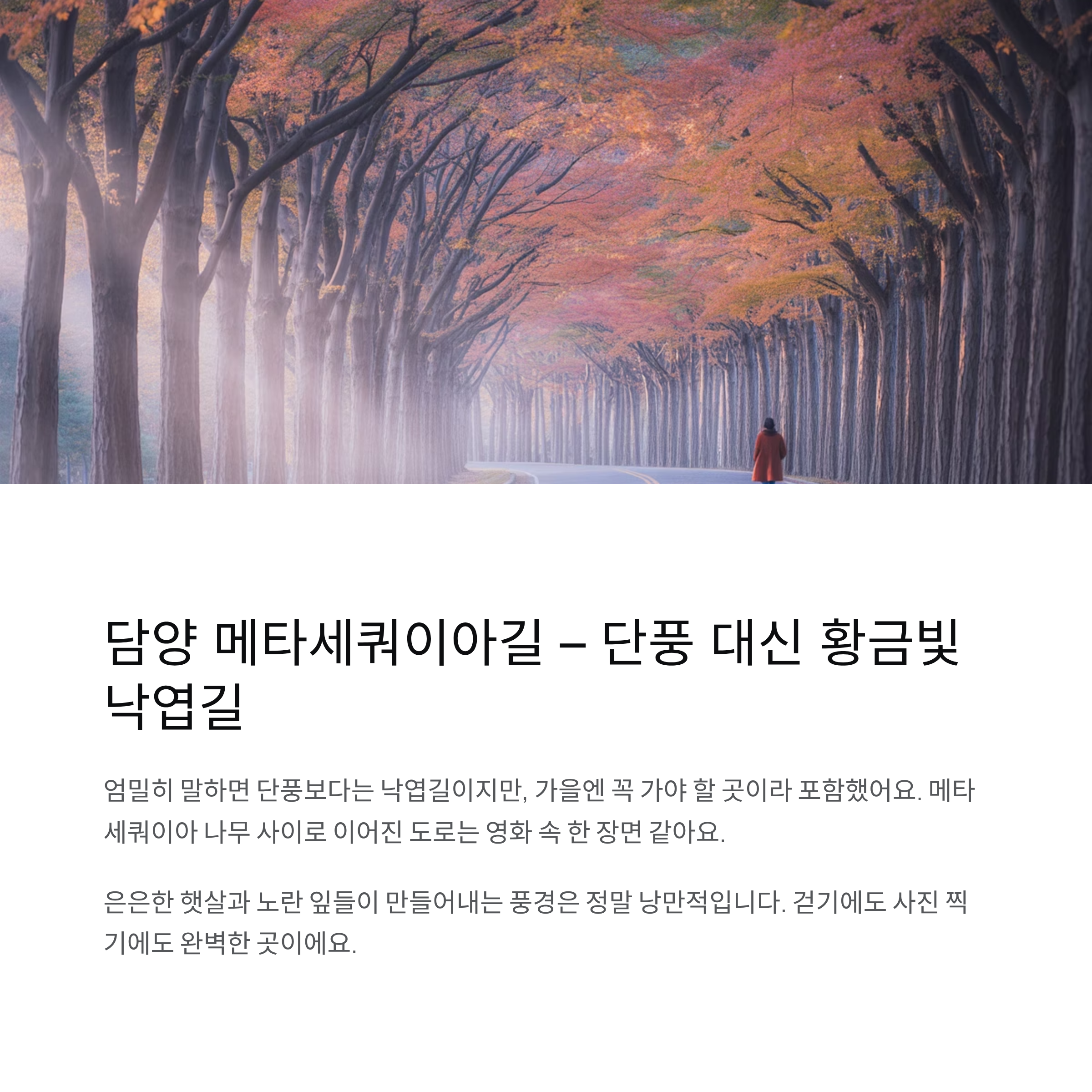 엄밀히 말하면 단풍보다는 낙엽길이지만, 가을엔 꼭 가야 할 곳이라 포함했어요. 메타세쿼이아 나무 사이로 이어진 도로는 영화 속 한 장면 같아요. 은은한 햇살과 노란 잎들이 만들어내는 풍경은 정말 낭만적입니다. 걷기에도 사진 찍기에도 완벽한 곳이에요.