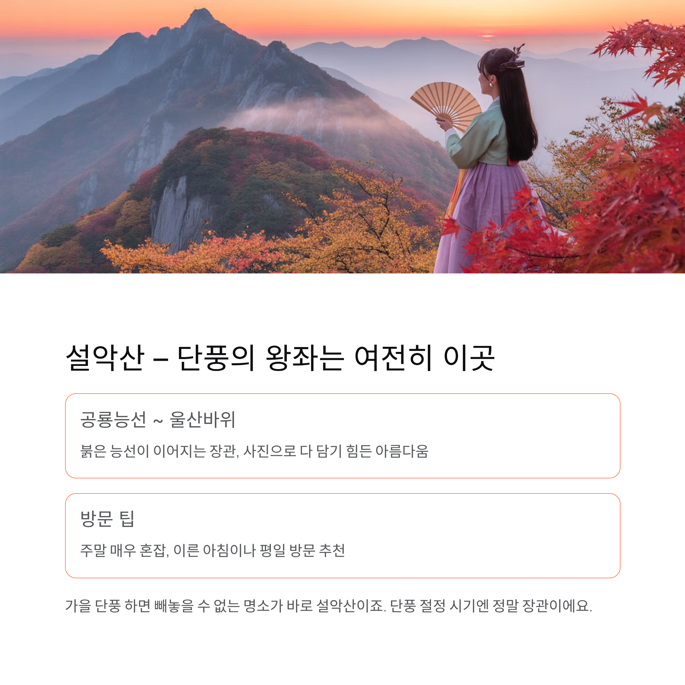 가을 단풍 하면 빼놓을 수 없는 명소가 바로 설악산이죠. 단풍 절정 시기엔 정말 장관이에요. 특히 공룡능선부터 울산바위까지 이어지는 붉은 능선은 사진으로 다 담기 힘든 아름다움이에요. 다만 주말엔 매우 혼잡하니 이른 아침 또는 평일 방문을 추천해요.