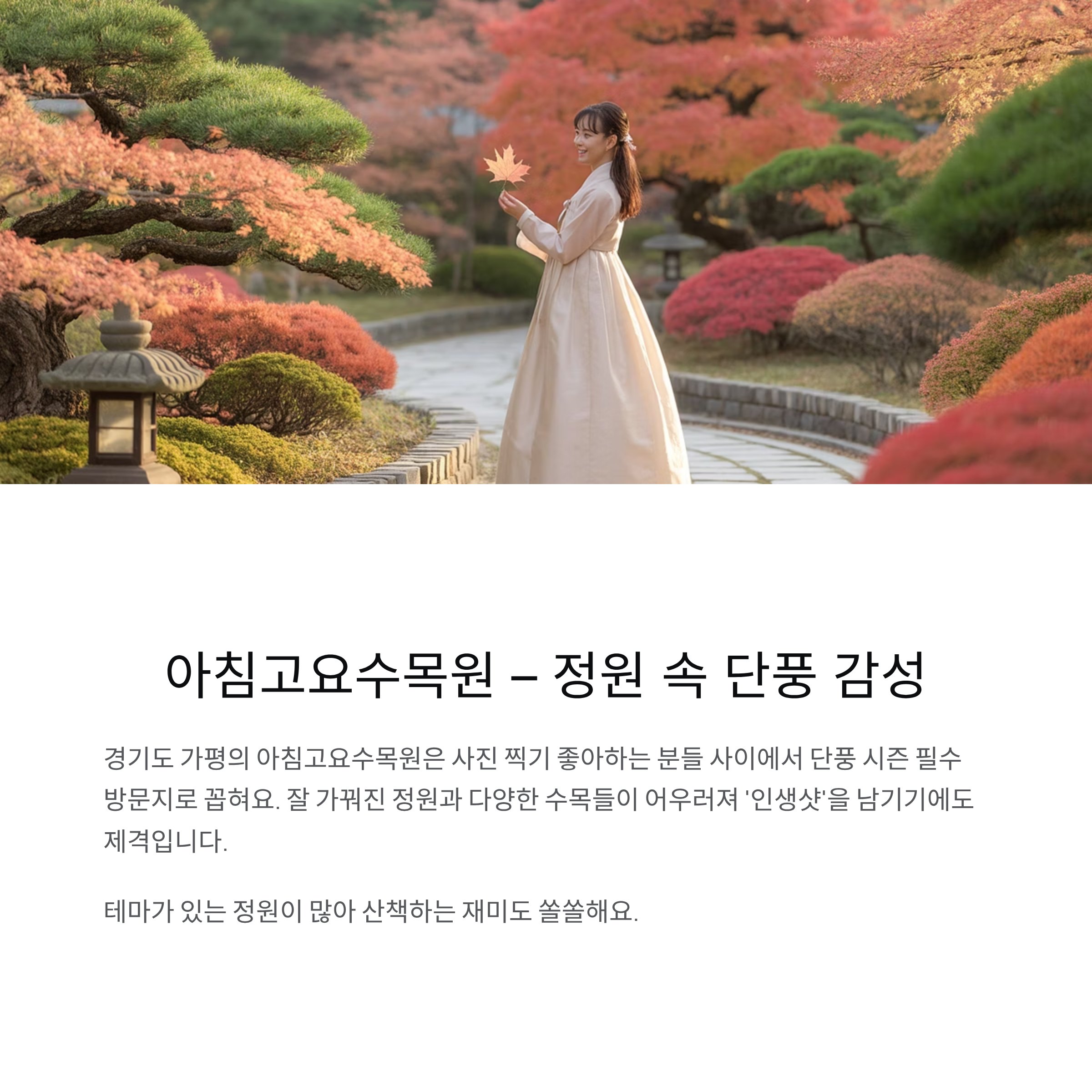 경기도 가평의 아침고요수목원은 사진 찍기 좋아하는 분들 사이에서 단풍 시즌 필수 방문지로 꼽혀요. 잘 가꿔진 정원과 다양한 수목들이 어우러져 ‘인생샷’을 남기기에도 제격입니다. 테마가 있는 정원이 많아 산책하는 재미도 쏠쏠해요.