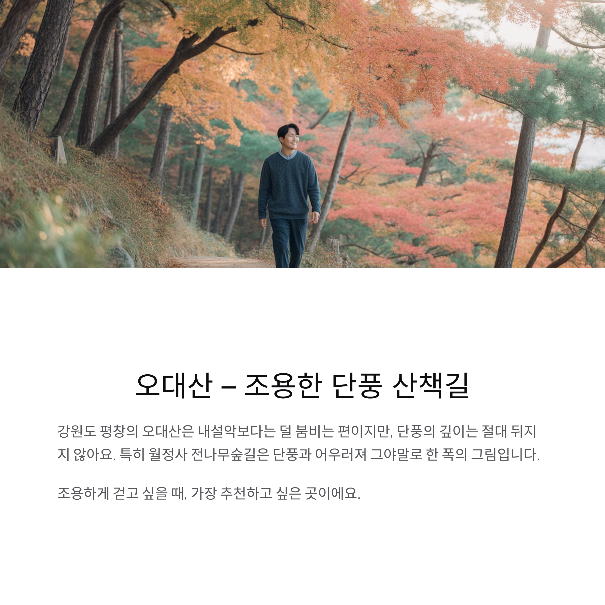 강원도 평창의 오대산은 내설악보다는 덜 붐비는 편이지만, 단풍의 깊이는 절대 뒤지지 않아요. 특히 월정사 전나무숲길은 단풍과 어우러져 그야말로 한 폭의 그림입니다. 조용하게 걷고 싶을 때, 가장 추천하고 싶은 곳이에요.