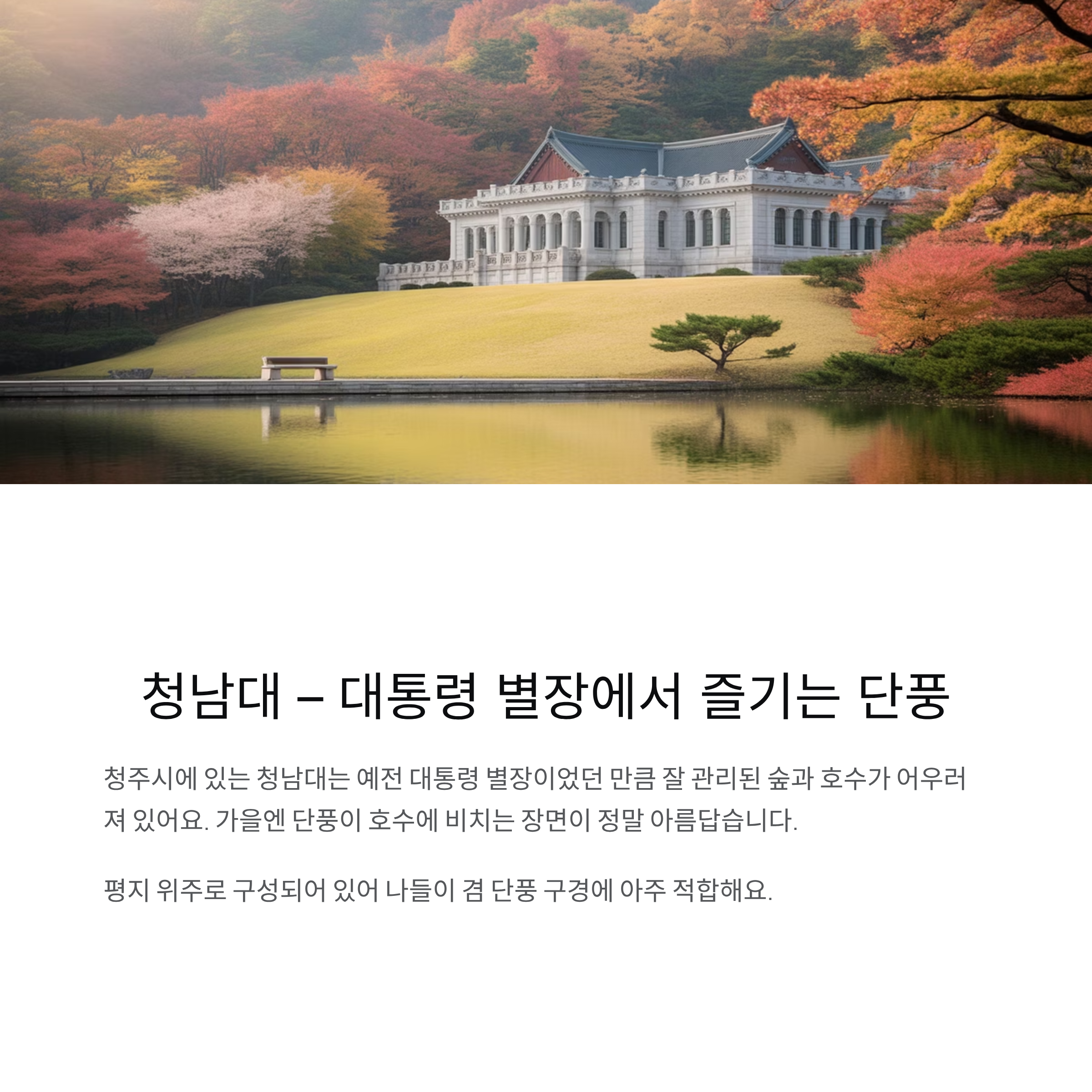청주시에 있는 청남대는 예전 대통령 별장이었던 만큼 잘 관리된 숲과 호수가 어우러져 있어요. 가을엔 단풍이 호수에 비치는 장면이 정말 아름답습니다. 평지 위주로 구성되어 있어 나들이 겸 단풍 구경에 아주 적합해요.