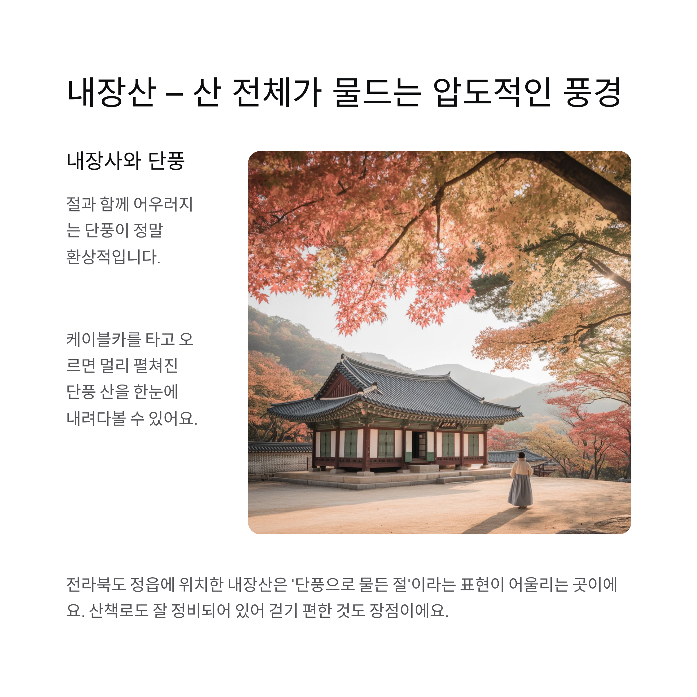 전라북도 정읍에 위치한 내장산은 ‘단풍으로 물든 절’이라는 표현이 어울리는 곳이에요. 내장사와 함께 어우러지는 단풍이 정말 환상적입니다. 케이블카를 타고 오르면 멀리 펼쳐진 단풍 산을 한눈에 내려다볼 수 있어요. 산책로도 잘 정비되어 있어 걷기 편한 것도 장점이에요.