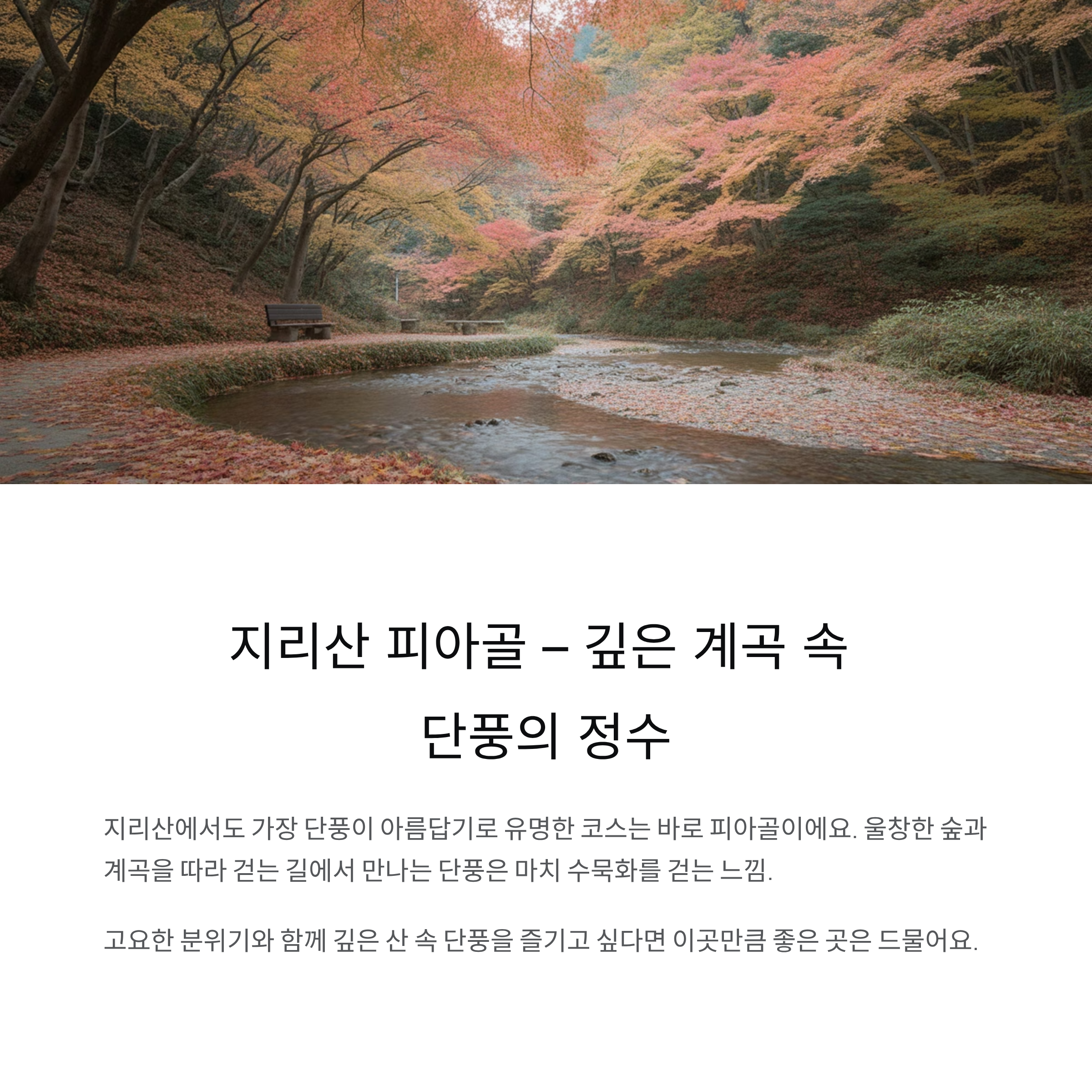 지리산에서도 가장 단풍이 아름답기로 유명한 코스는 바로 피아골이에요. 울창한 숲과 계곡을 따라 걷는 길에서 만나는 단풍은 마치 수묵화를 걷는 느낌. 고요한 분위기와 함께 깊은 산 속 단풍을 즐기고 싶다면 이곳만큼 좋은 곳은 드물어요.