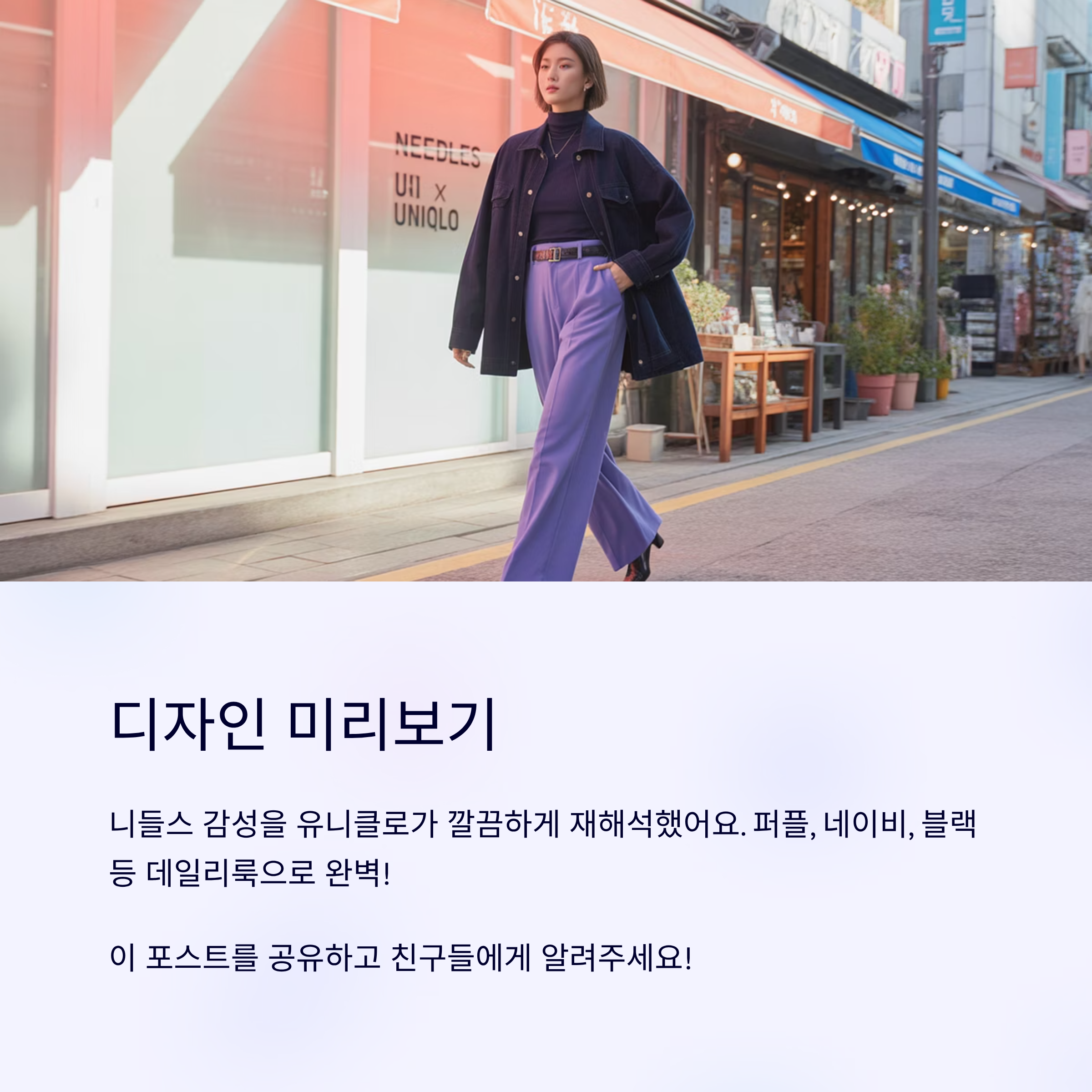 공개된 디자인 일부를 보면, 기존 니들스 감성을 유니클로가 깔끔하게 풀어낸 느낌이에요. 트렌디하면서도 부담스럽지 않아 다양한 연령층이 활용하기 좋아 보입니다.