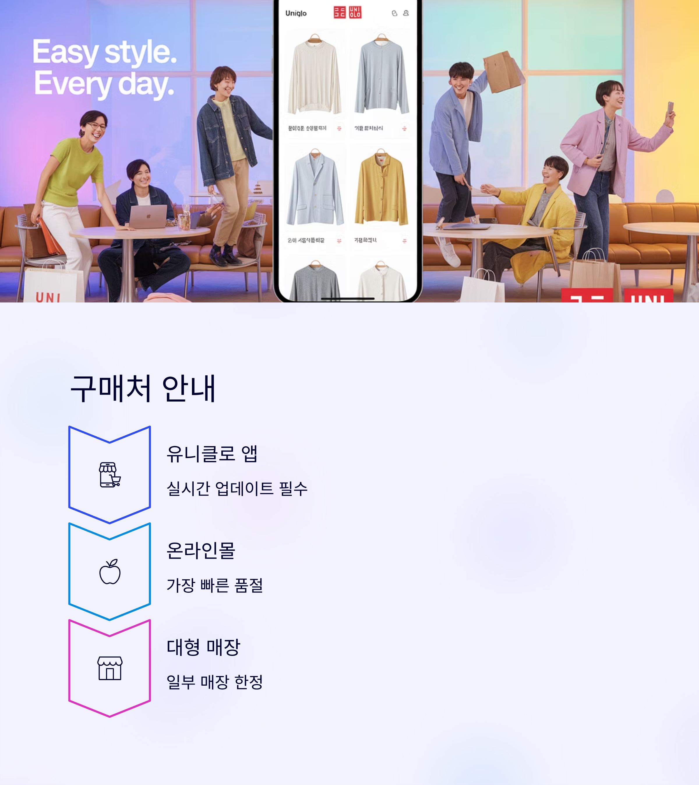 일반적으로 유니클로 협업 상품은 온라인몰과 일부 대형 매장에서 동시 발매됩니다. 단, 인기 제품의 경우 매장보다 온라인이 훨씬 빠르게 품절되는 경우가 많죠.