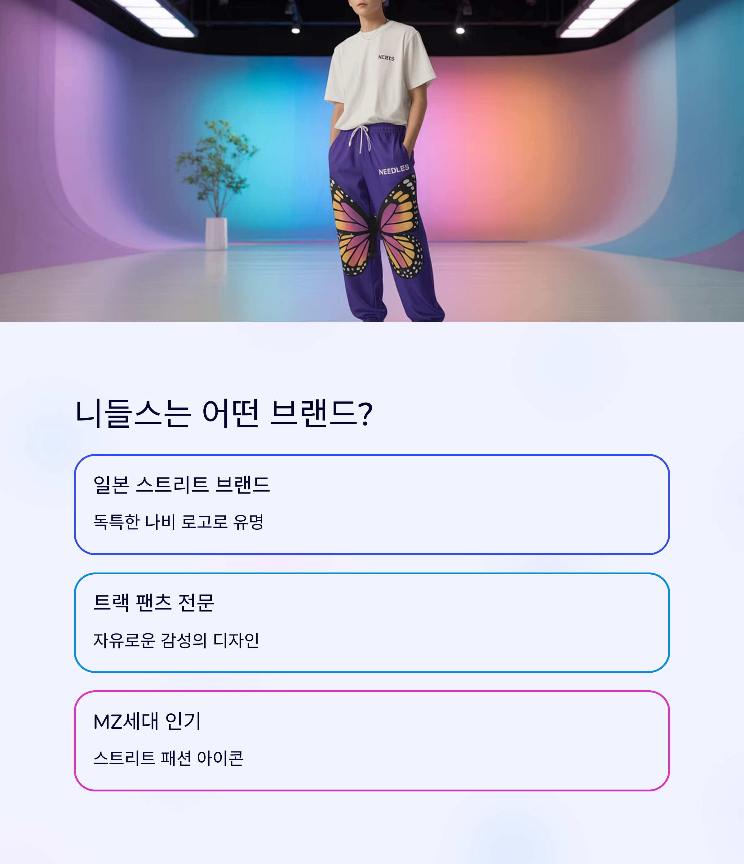 니들스는 일본 기반의 스트리트 패션 브랜드로, 특유의 나비 로고와 트랙 팬츠 디자인으로 유명하죠. 독특하면서도 자유로운 감성으로 MZ세대에게 특히 인기가 많은데요.