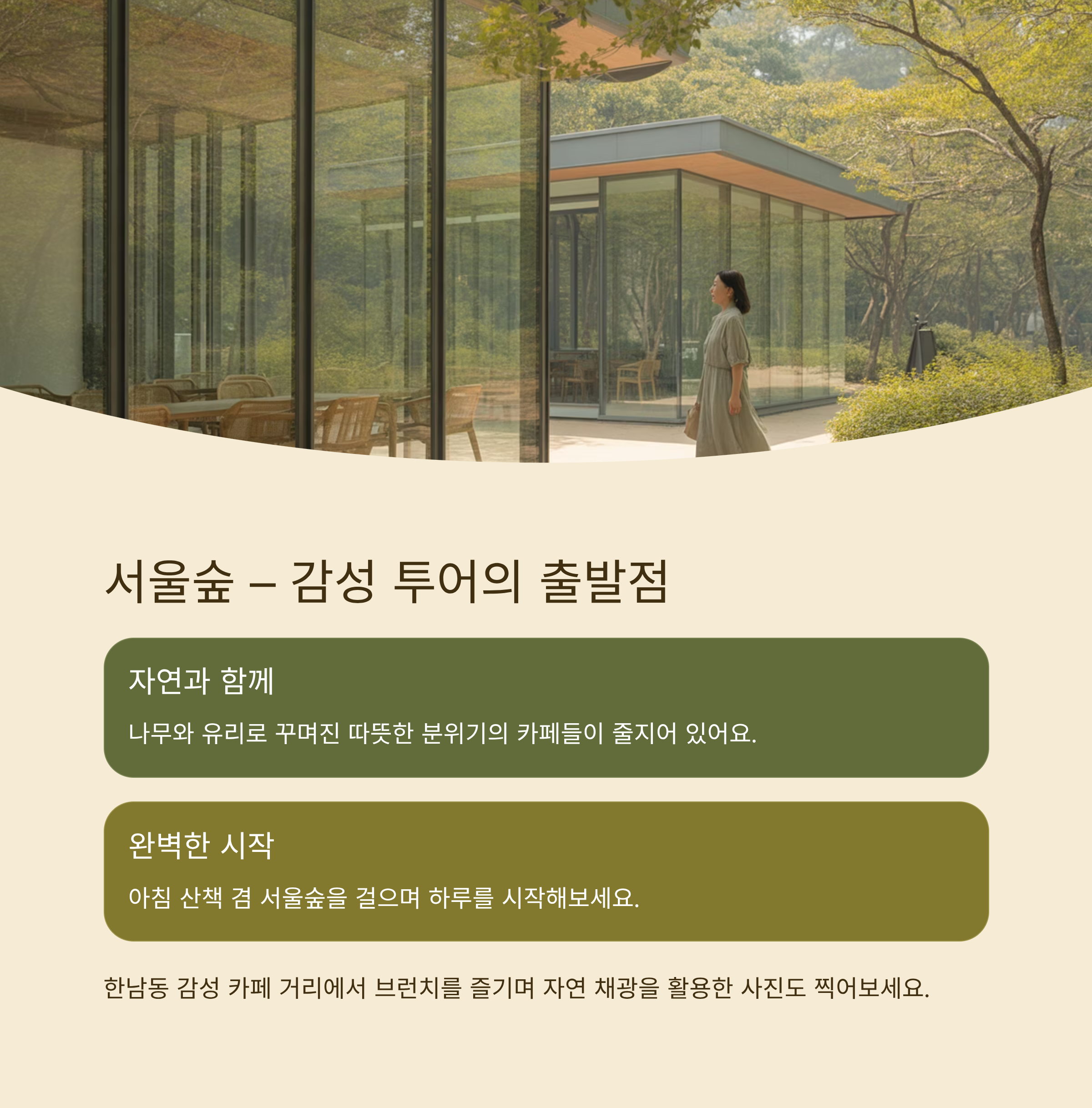 서울숲 근처에는 나무와 유리로 꾸며진 따뜻한 분위기의 카페들이 줄지어 있어요.