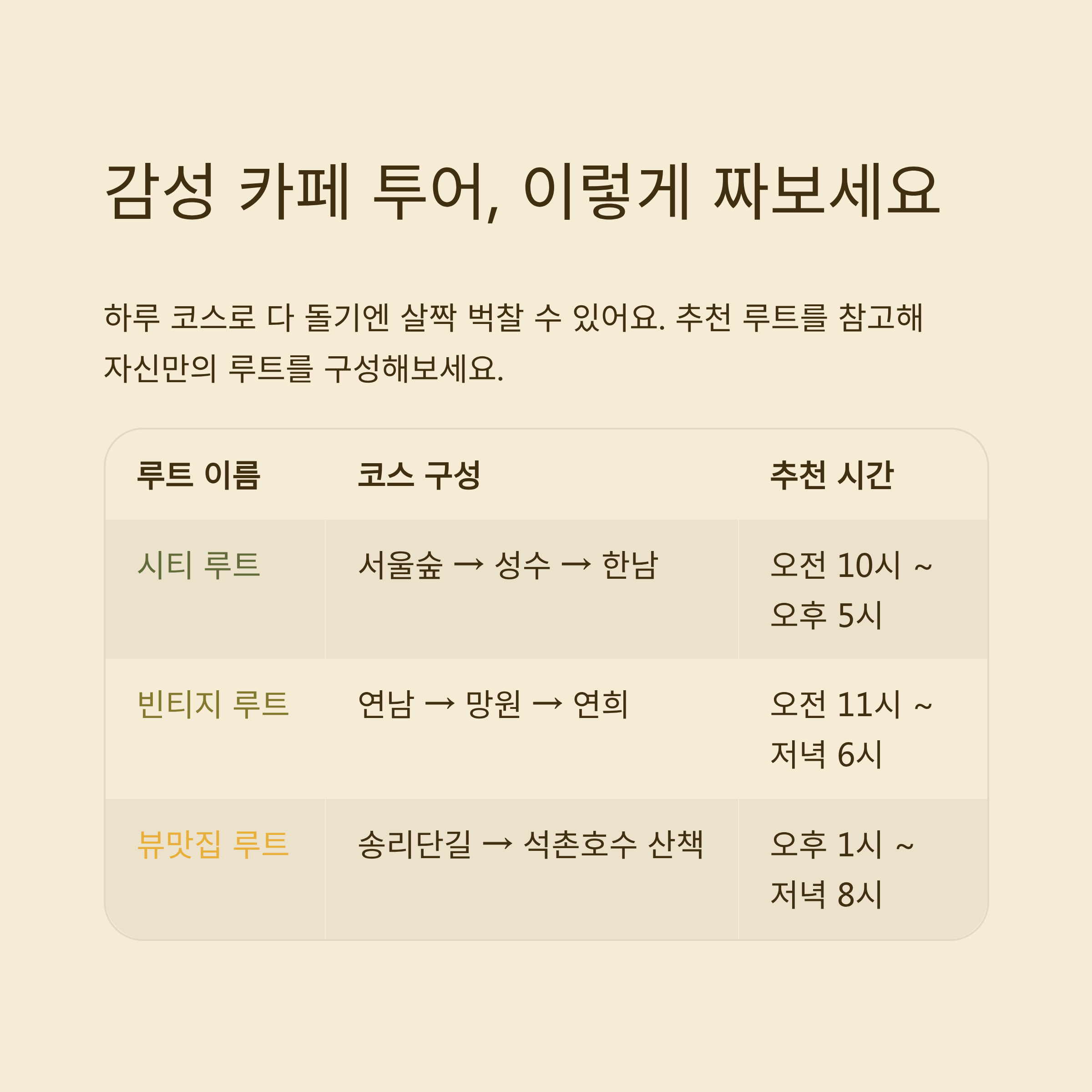 바쁜 일상 속 힐링이 필요할 때, 하루쯤은 감성 가득한 카페에서 여유를 즐기고 싶지 않으신가요? 인스타그램 피드에 올릴만한 예쁜 사진은 덤이고, 맛있는 디저트와 커피는 필수! 오늘은 당일치기로 다녀올 수 있는 감성 카페 투어 코스를 소개해드릴게요. 서울과 근교 중심으로 구성해, 교통 편의성까지 고려했답니다.