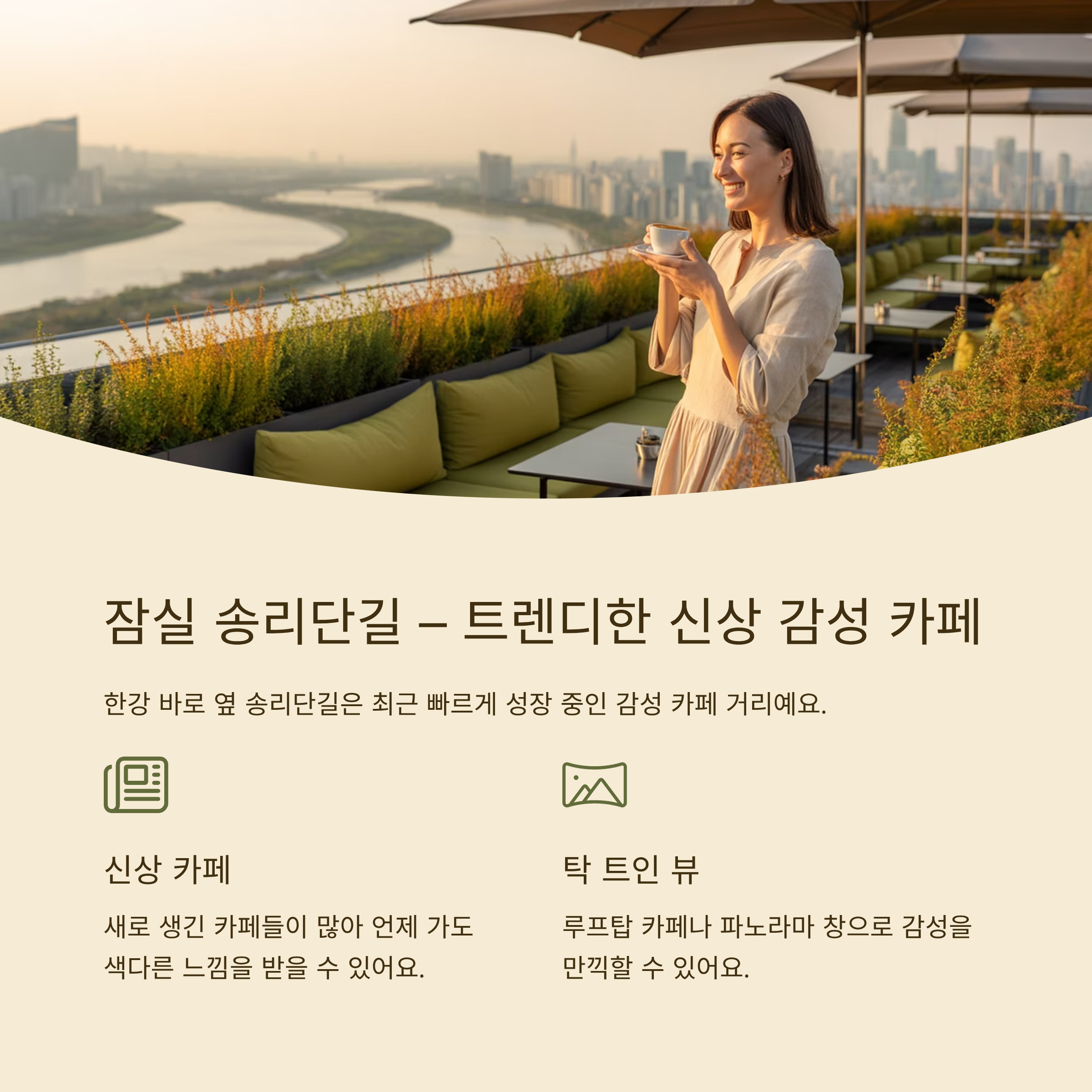 한강 바로 옆 송리단길은 최근 빠르게 성장 중인 감성 카페 거리예요.