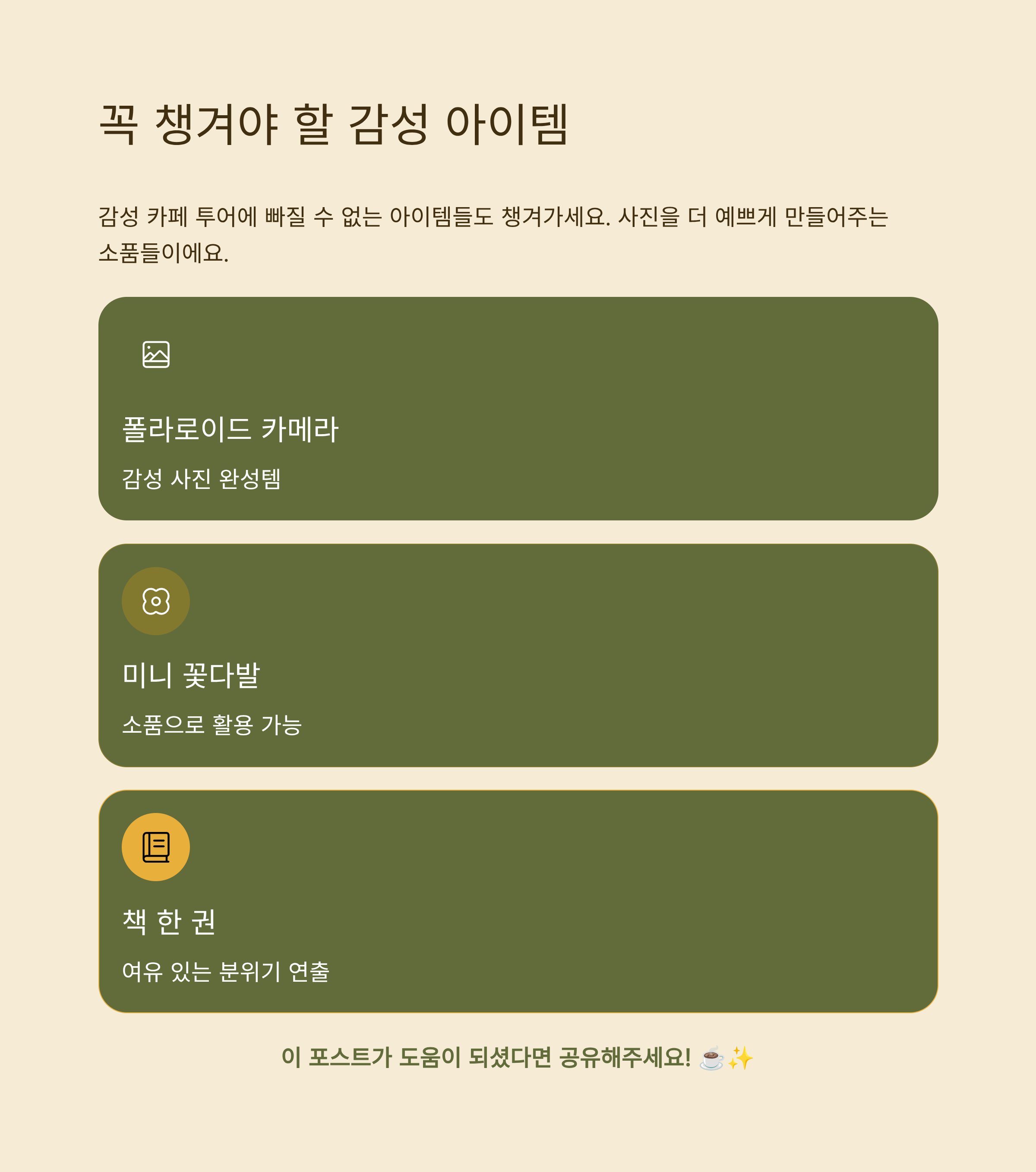 감성 카페 투어에 빠질 수 없는 아이템들도 챙겨가세요.