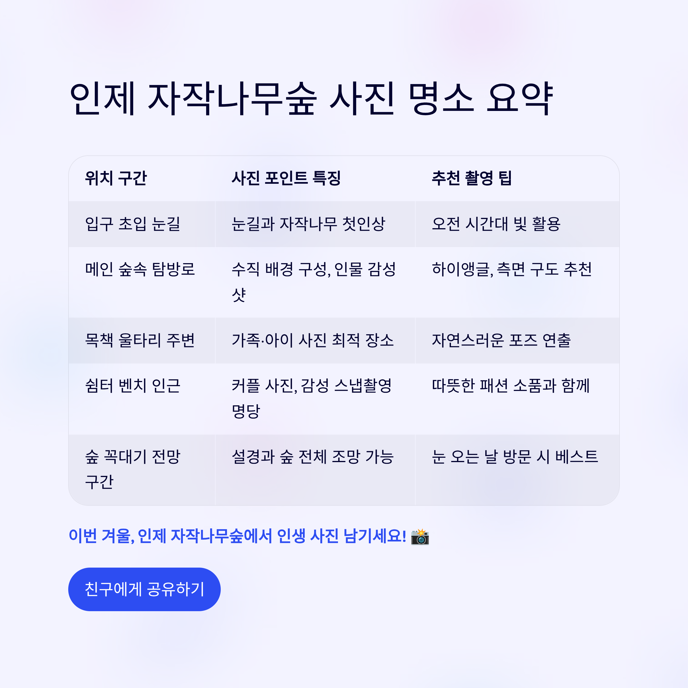 인제 자작나무숲 사진 명소 요약표