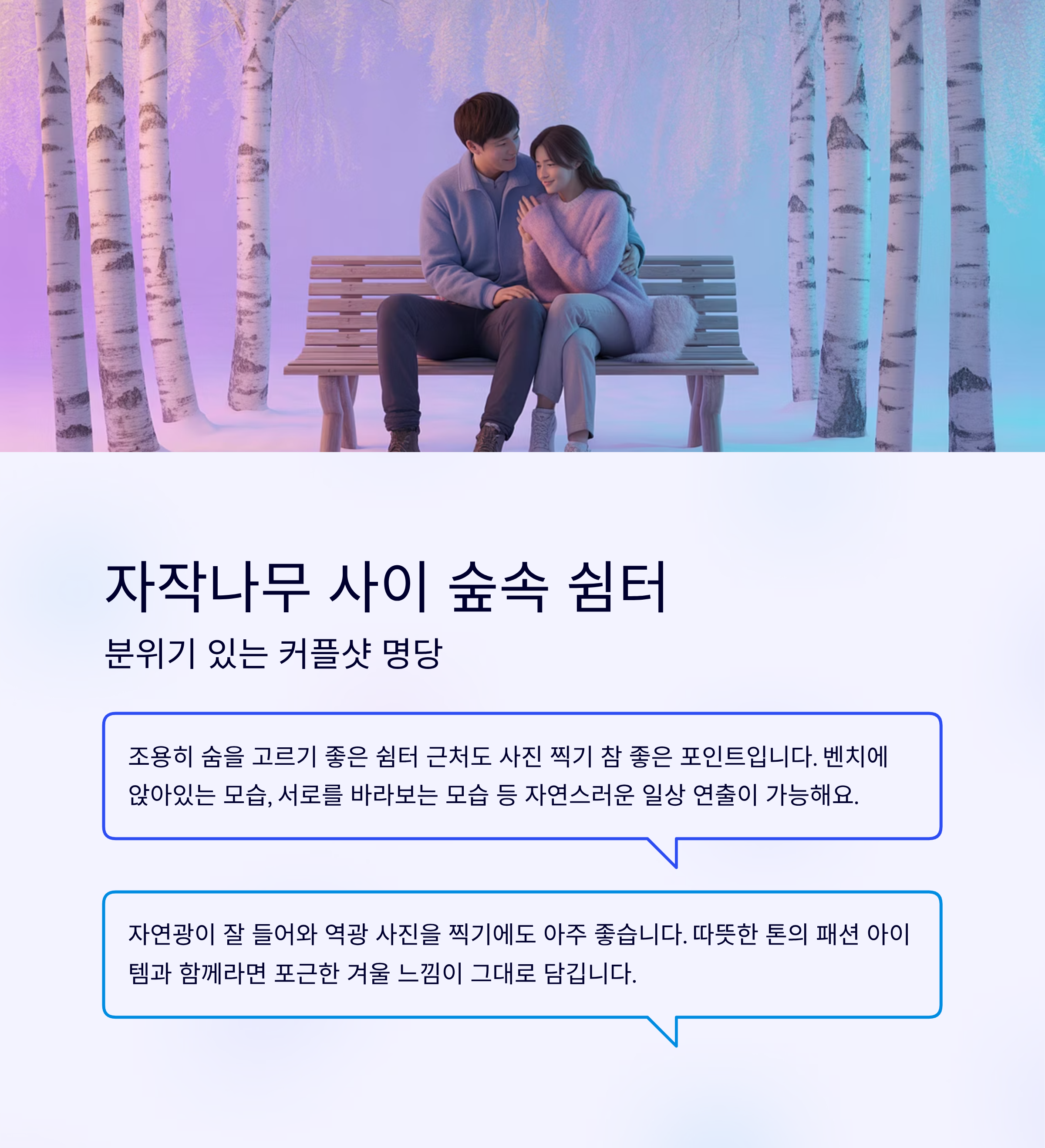 | 쉼터 벤치 인근 | 커플 사진, 감성 스냅촬영 명당 | 따뜻한 패션 소품과 함께 |