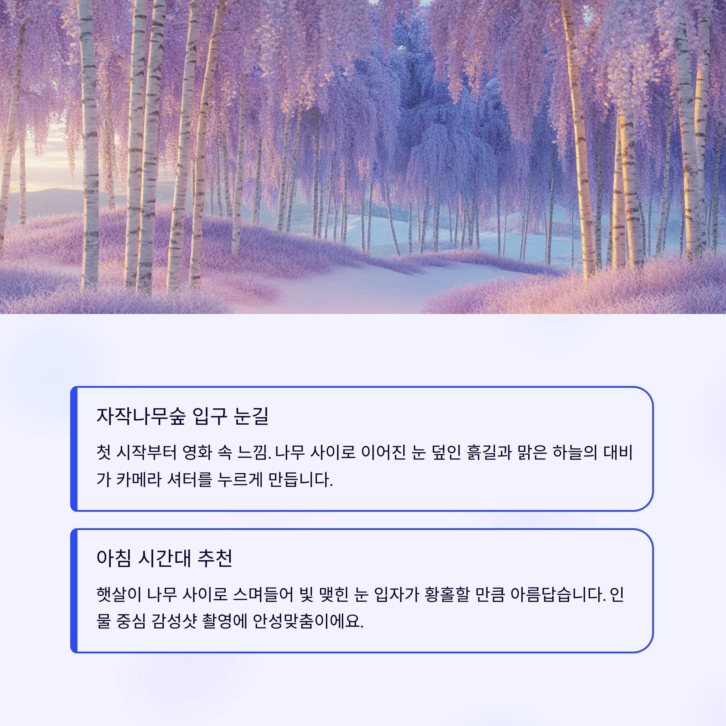 | 입구 초입 눈길 | 눈길과 자작나무 첫인상 | 오전 시간대 빛 활용 |