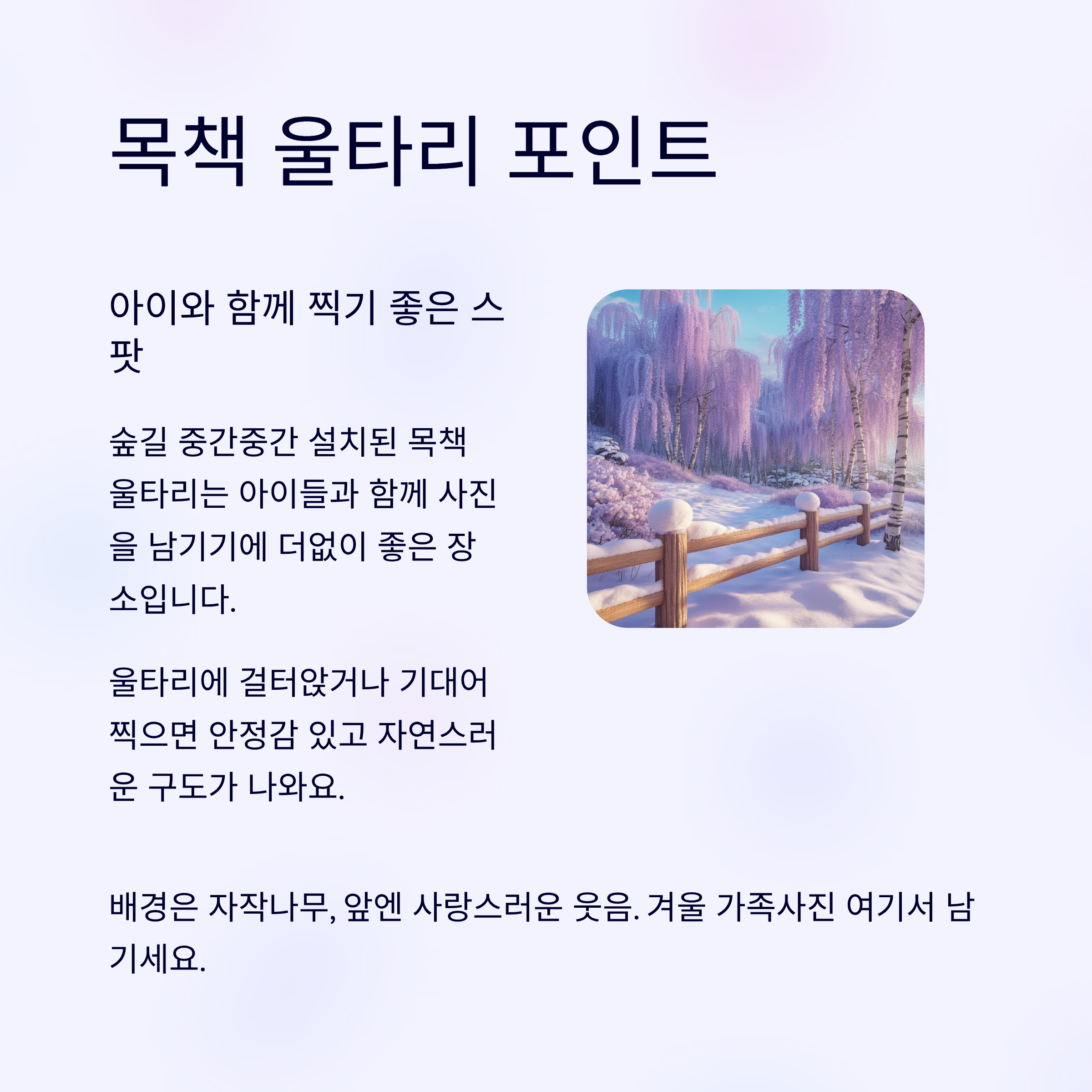 | 목책 울타리 주변 | 가족·아이 사진 최적 장소 | 자연스러운 포즈 연출 |