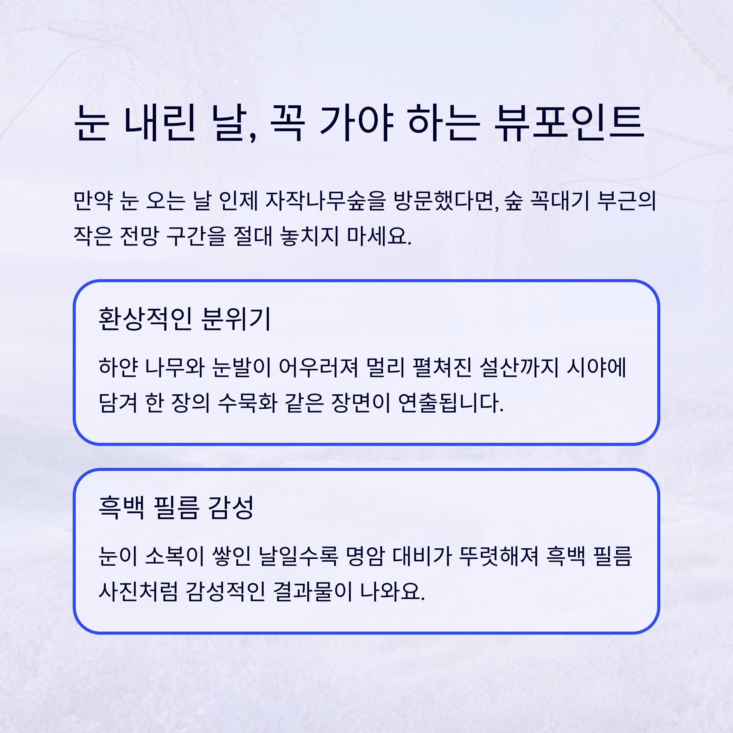 | 숲 꼭대기 전망 구간 | 설경과 숲 전체 조망 가능 | 눈 오는 날 방문 시 베스트 |