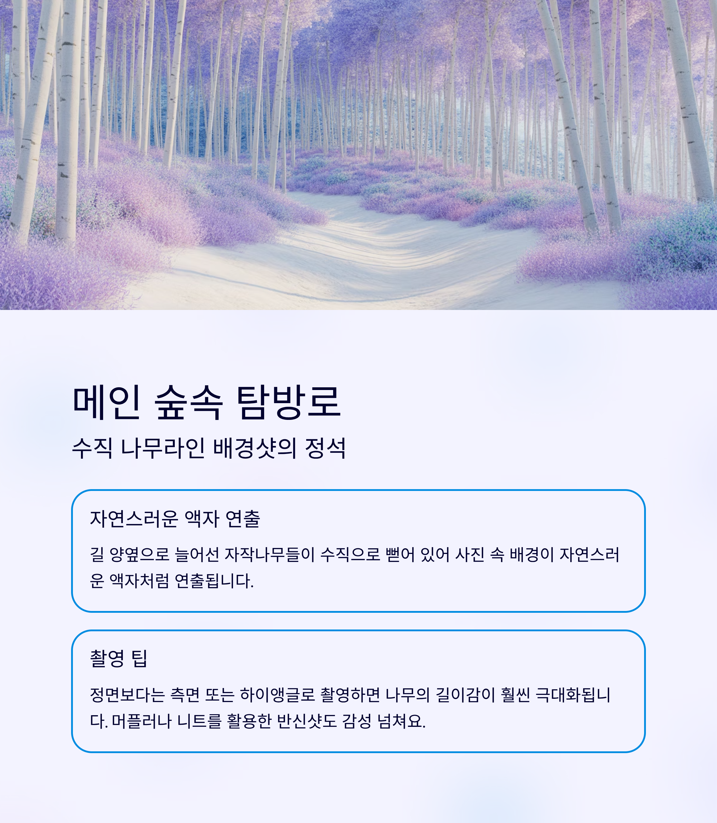 | 메인 숲속 탐방로 | 수직 배경 구성, 인물 감성샷 | 하이앵글, 측면 구도 추천 |