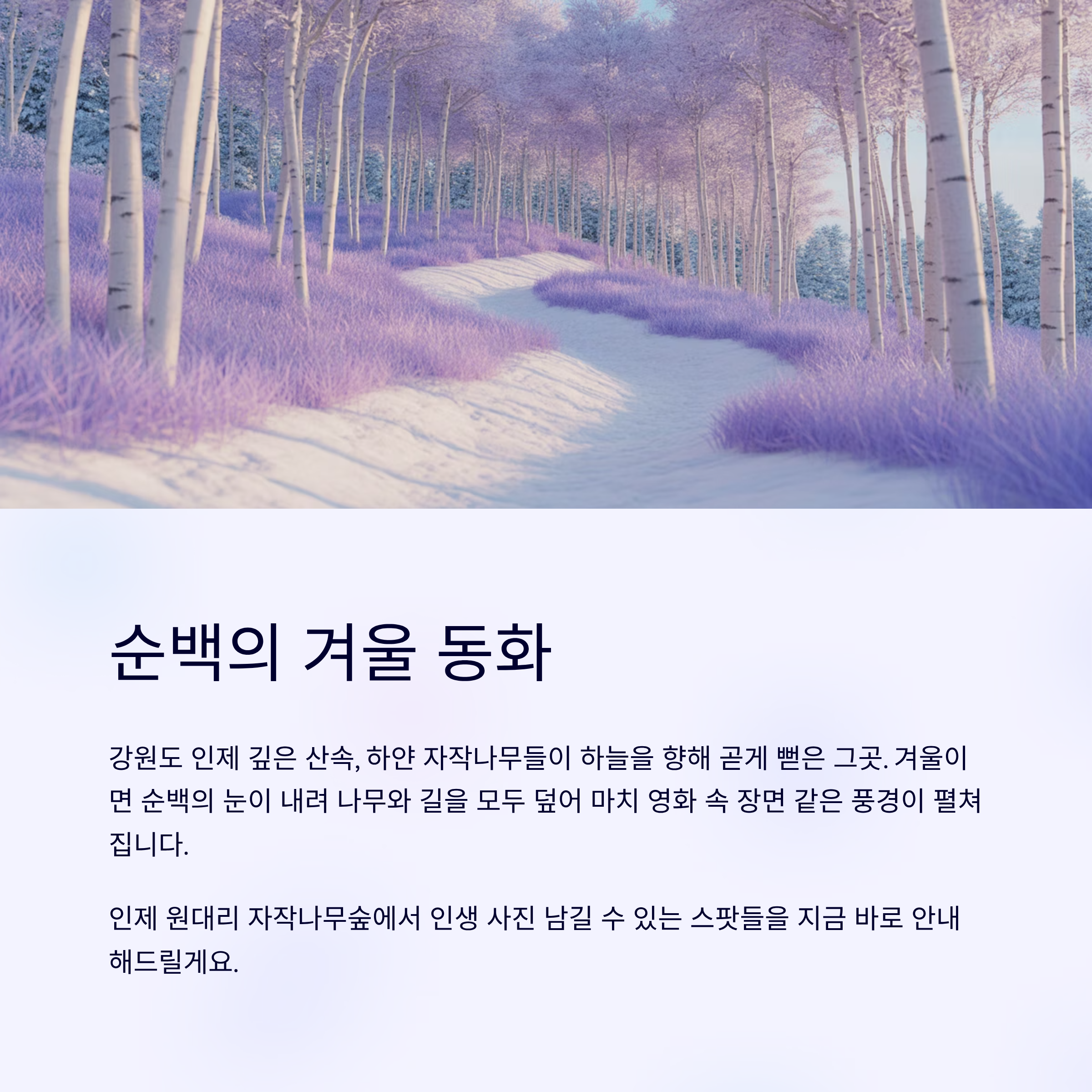 강원도 인제 깊은 산속, 하얀 자작나무들이 하늘을 향해 곧게 뻗은 그곳. 겨울이면 순백의 눈이 내려 나무와 길을 모두 덮어 마치 영화 속 장면 같은 풍경이 펼쳐집니다. 인제 원대리 자작나무숲은 그 자체로 아름답지만, 조금만 눈을 돌리면 감성 가득한 사진 명소들이 곳곳에 숨어 있답니다. 이번 겨울, 인제 자작나무숲에서 인생 사진 남길 수 있는 스팟들 지금 바로 안내해드릴게요.
