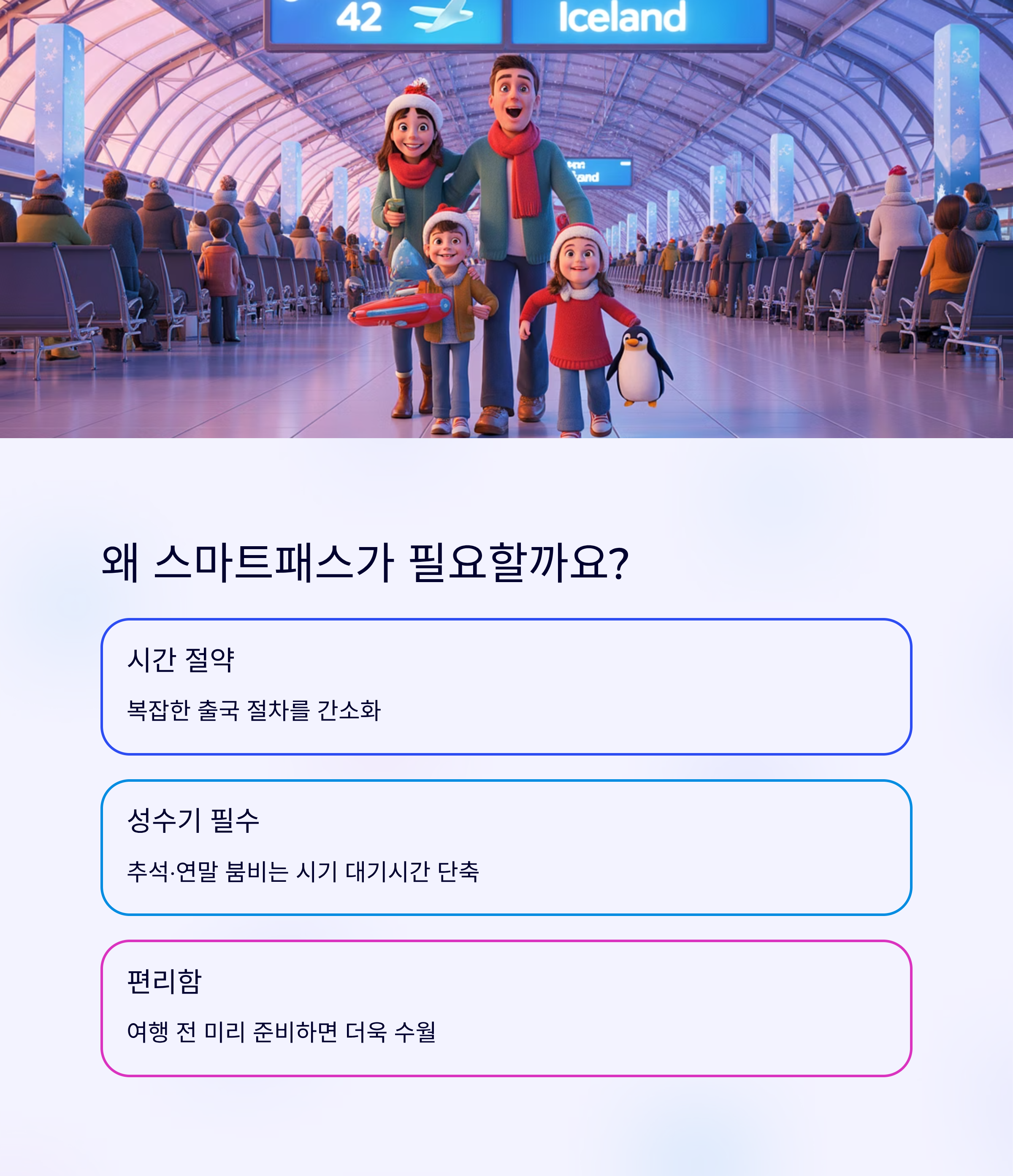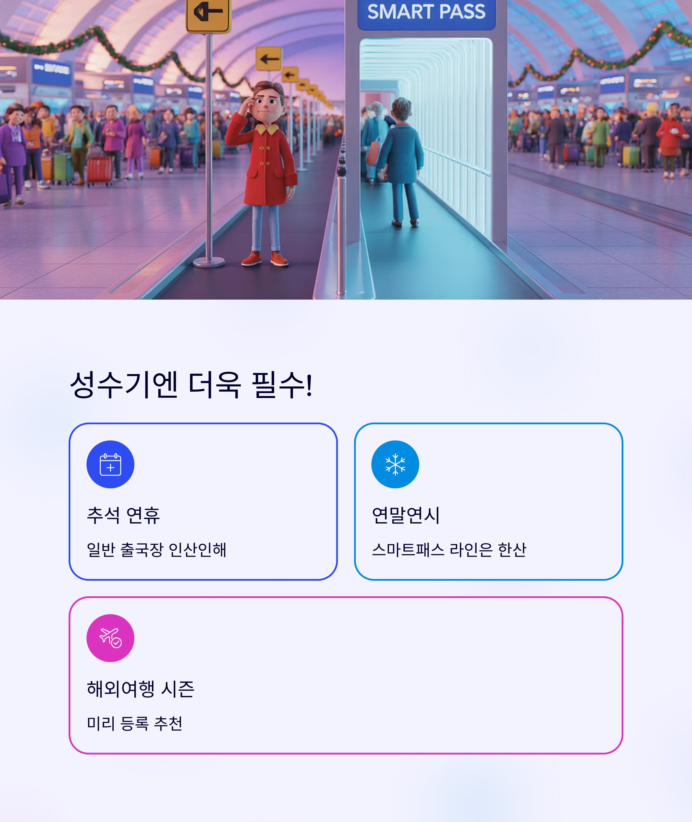 인천공항 스마트패스는 비행기 탑승 전 복잡한 출국 절차를 간소화해주는 유용한 서비스입니다. 특히 해외여행 시즌이나 추석·연말 연휴처럼 붐비는 시기엔 대기 시간을 줄일 수 있어 많은 분들이 관심을 갖고 계시죠. 이번 글에서는 인천공항 스마트패스 등록 방법부터 1터미널, 2터미널 별 이용 팁까지 한눈에 정리해 드릴게요. 여행 전 꼭 체크해보시길 바랍니다!