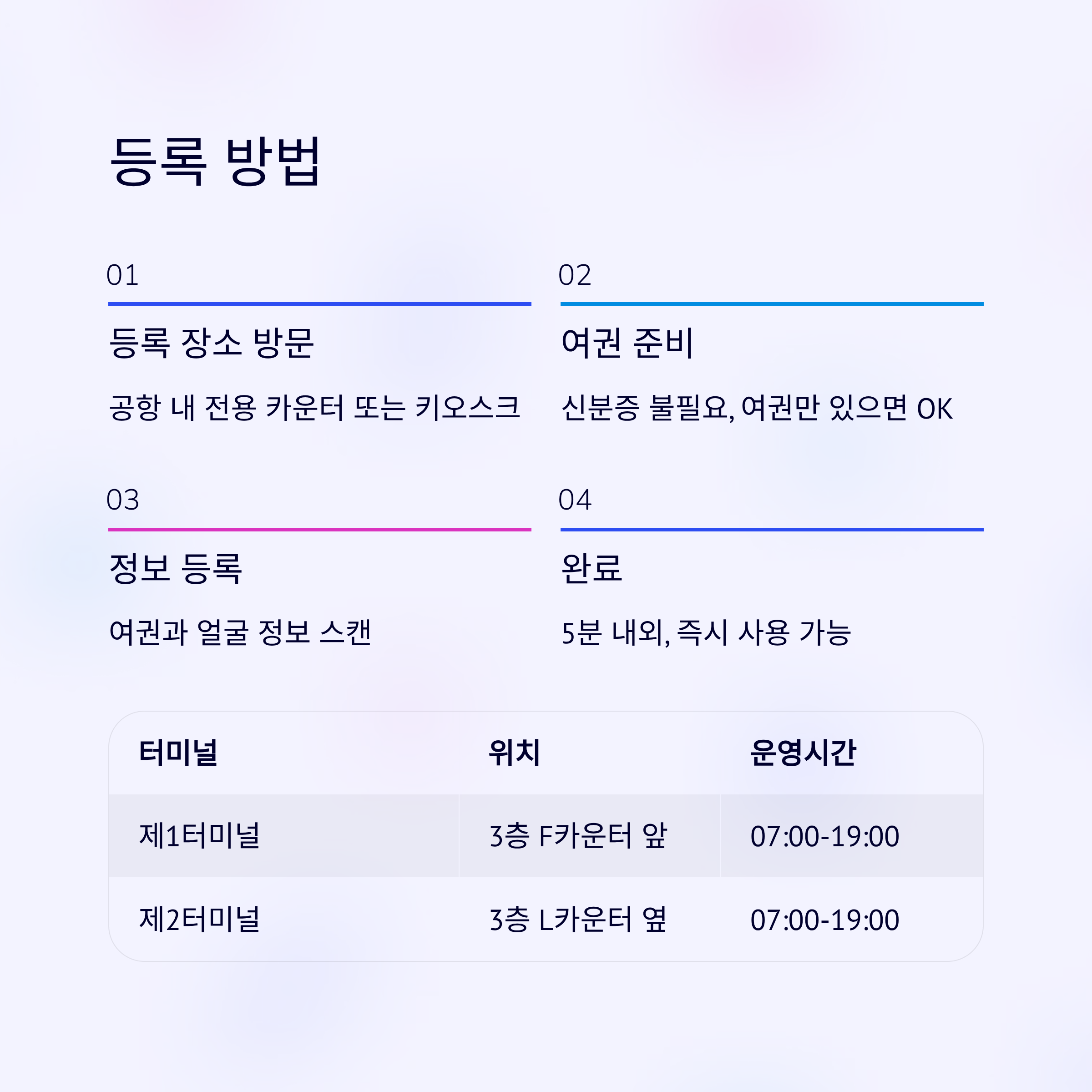 | 제2터미널 3층 L카운터 옆 | 07:00~19:00 | 등록 즉시 사용 가능 |